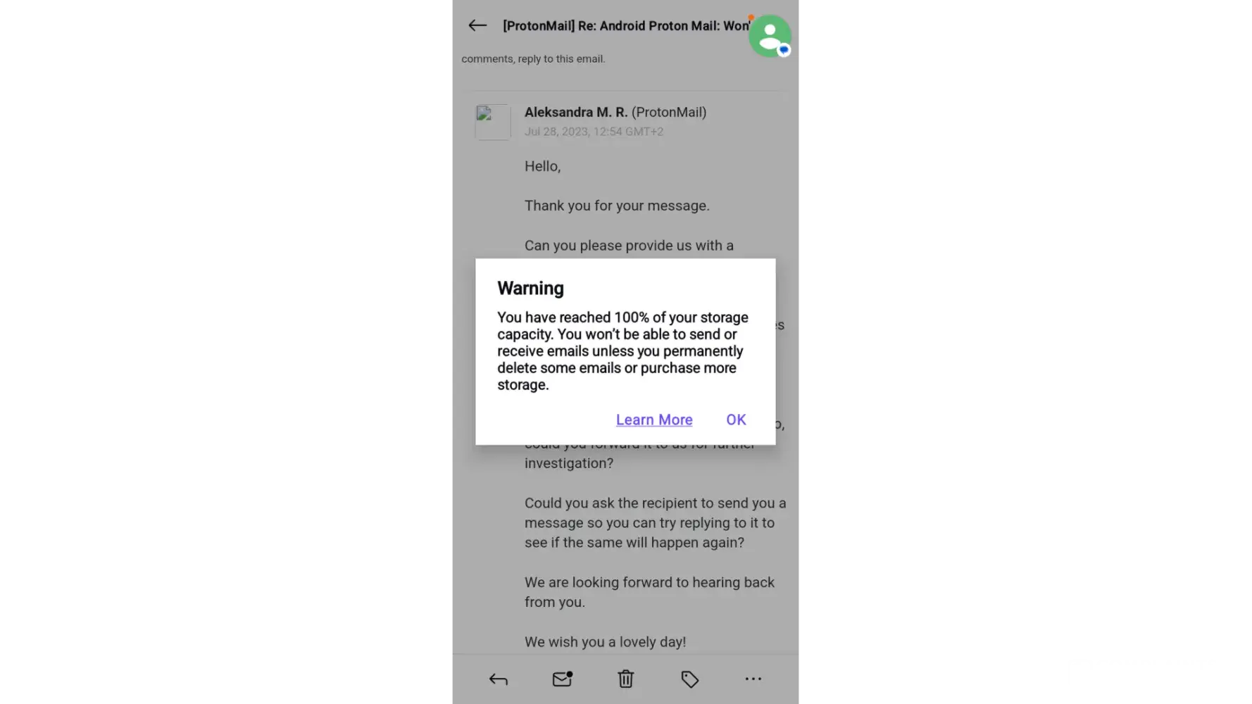 I have been trying to reply to my emails for over a week now every time I get the massage that I am out of storage. I can't even send ProtonMail compliant from my email I get the same issues. I have sent you a notice of this 3 times you looked in to it and confirmed that I am indeed not out of storage and should be able to send emails and yet I am still not. How do I fix this I would like to use my Proton Mail as it's main email. You can reach me via my email but I cannot reply even to you