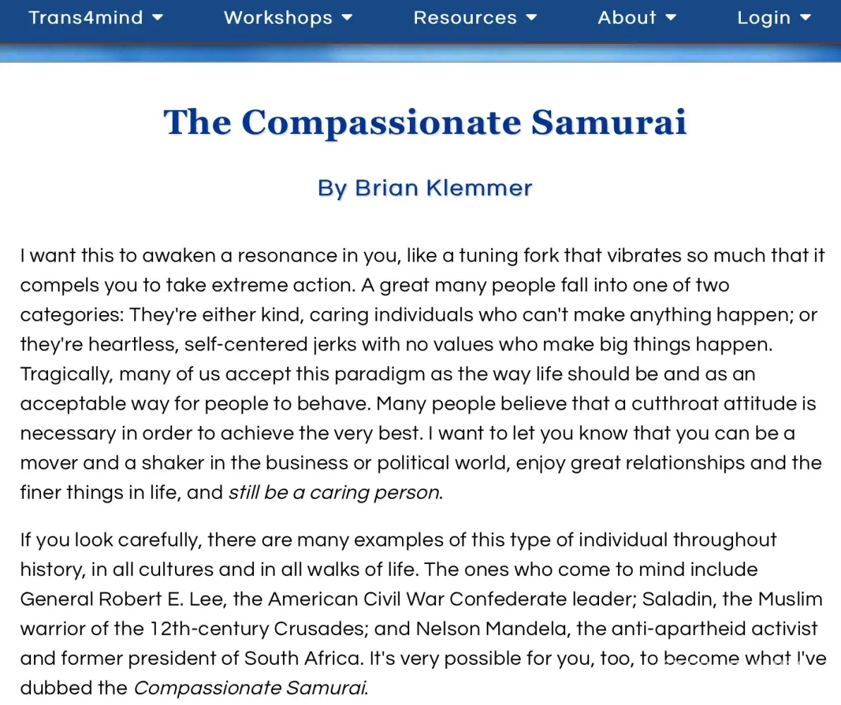 The founder Brian Klemmer in a blog post in Trans4mind touts Robert E. Lee as an exemplary model of the Compassionate Samurai. General Robert E. Lee owned slaves and fought for right to keep slaves!