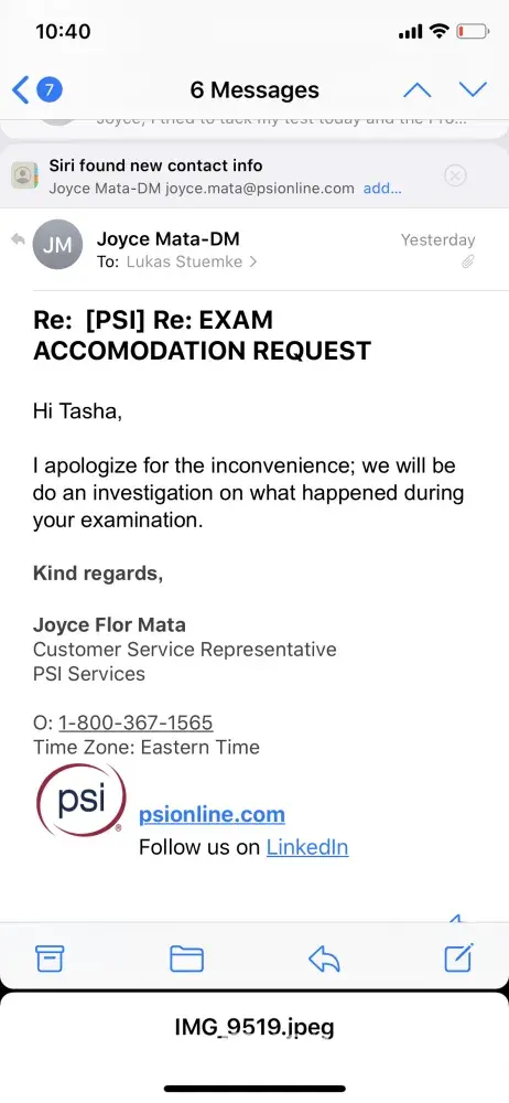 To whom it may concern, I appreciate your apology however I have been trying to accomplish taking a test for over eight weeks with your company and your company has done nothing but discriminate against me and dictate what I canning can't have when it was clearly stated in all the documentation what I need to be successful! I am not asking permission from PSI exam to use the accommodations that I am rightfully allowed! I have contacted cat contacted the justice department and filed a formal complaint against your company and if I don't have an answer by Monday how you're going to accommodate me and fix this there is going to be further documentation with my advocate from the ADA.