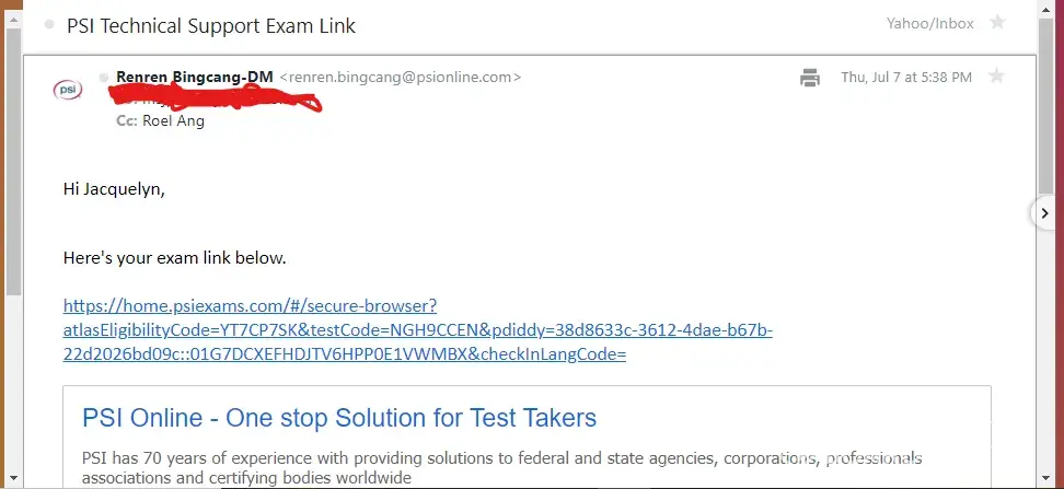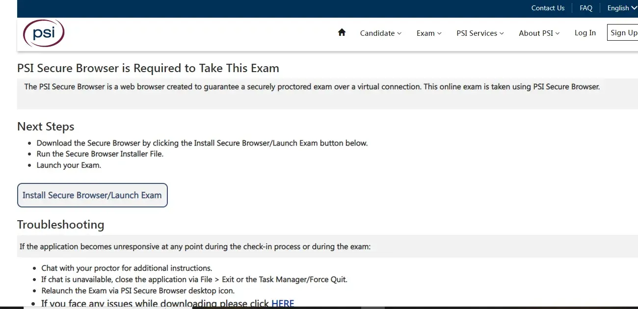 PSI Examination Technical support did not help me at all. What they did do was help me loose my job. This meant so much to me, my bread and butter gone and this was nothing but a joke to them. I lost money, time and my job. I tried to take my exam and never ever received so many technical issues when testing. I couldn't ask for a refund because I had to get this done ASAP for my job. Online proctors was not helpful at all. 30 minutes to hours before getting my test. I checked my computer for all compatibilities and everything checked out perfectly, perfectly for the test. When it was time to launch for the test it would not let me. All my coworkers used their work laptops and passed with no issues. Stressed and epic failure after epic failure after epic failure for me.