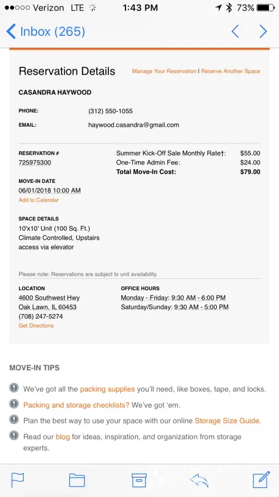 I reserved a storage unit 10/10 for $88 on 25 May 2018. I saw a cheaper price two days later and reserved the exact unit at $55.00.
