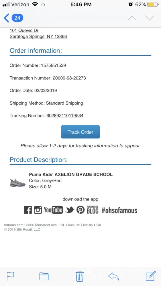 23 emails, 5 Messenger Messages, 10 twitter messages in addition to speaking with a litany of customer service agents, one supervisor and one online manager and NO one could assist me with tracking an order that was placed on September 18, 2019 . I have an email from Puma.com saying that order had been shipped on 9/20 . Very bad business practices.