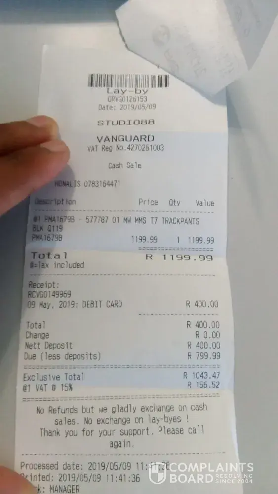 I purchased PUMA track pants at Studio 88 in Vangate Mall (Cape Town South Africa) 09 May 2019, the purchase was on layby the final payment was made in June, on my second use of the track pants it was torn at the back. Can I have these pants exchanged with the new one, I want the same design and size. please see attached photos of the track pants and the till slip.