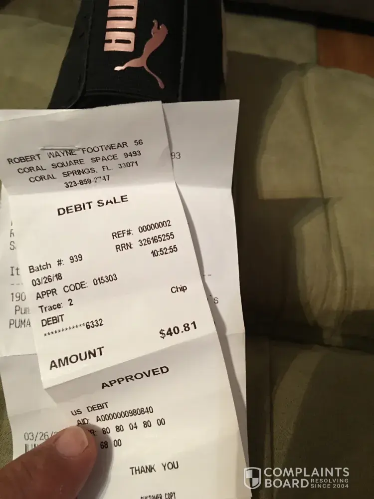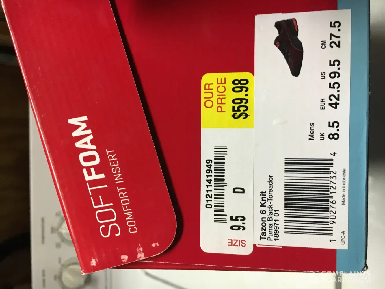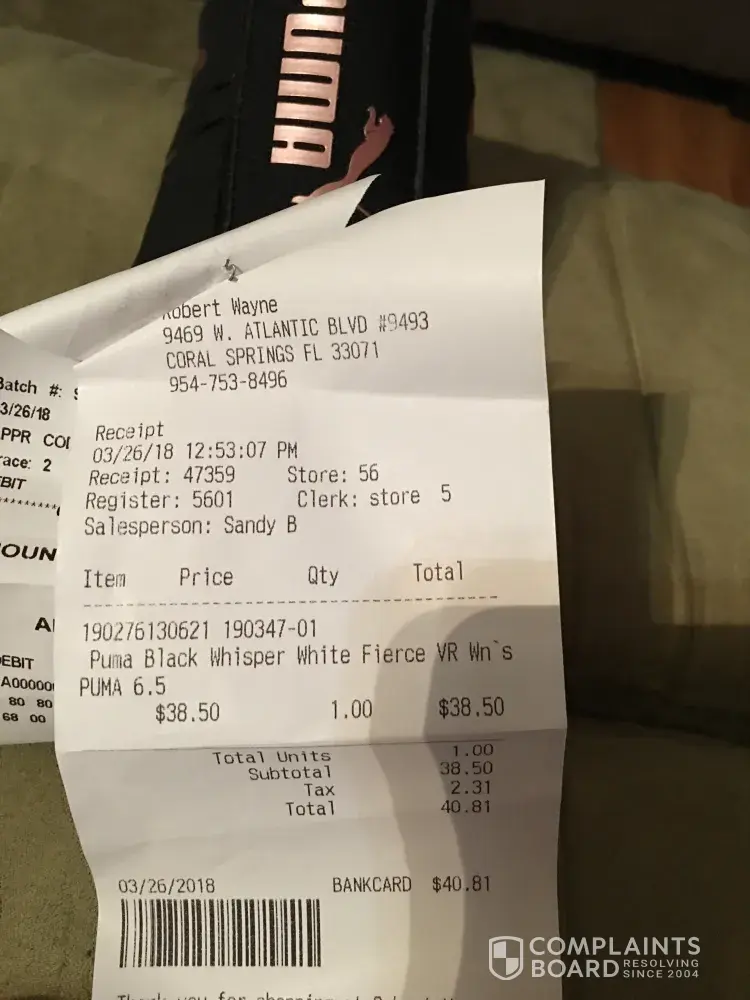 I bought a sports shoe from the puma showroom in quest mall last week. The salesman told me that I'll be getting an automated bill through sms but I never got one. Later I disdiscidiscovered that the price of the shoe was 2000 Rs less than the price she sold it to me in. It's very disappointing.
