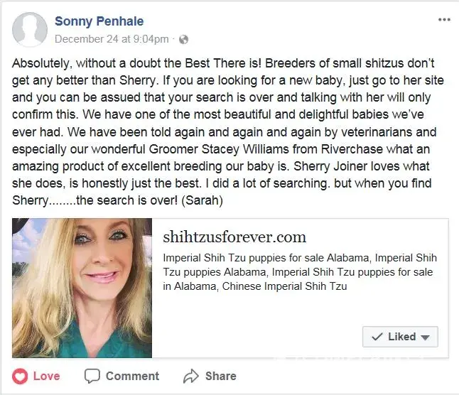 What else can I say about Sherry Joiner and ShihtzusForever! That's where I got both of my babies in December 2013. So proud of my beautiful, healthy fur babies! Sherry is so compassionate and has such a tender, loving heart for dogs. I wouldn't trust anyone else!