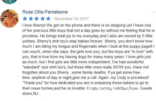 We have purchased two babies from Sherri and I have had 4 other Shih tzu's but I was impressed with her knowledge of the Shih tzu bread and the care she took with her babies. Two of my children also purchased puppies and they will not go anywhere else for future puppies.