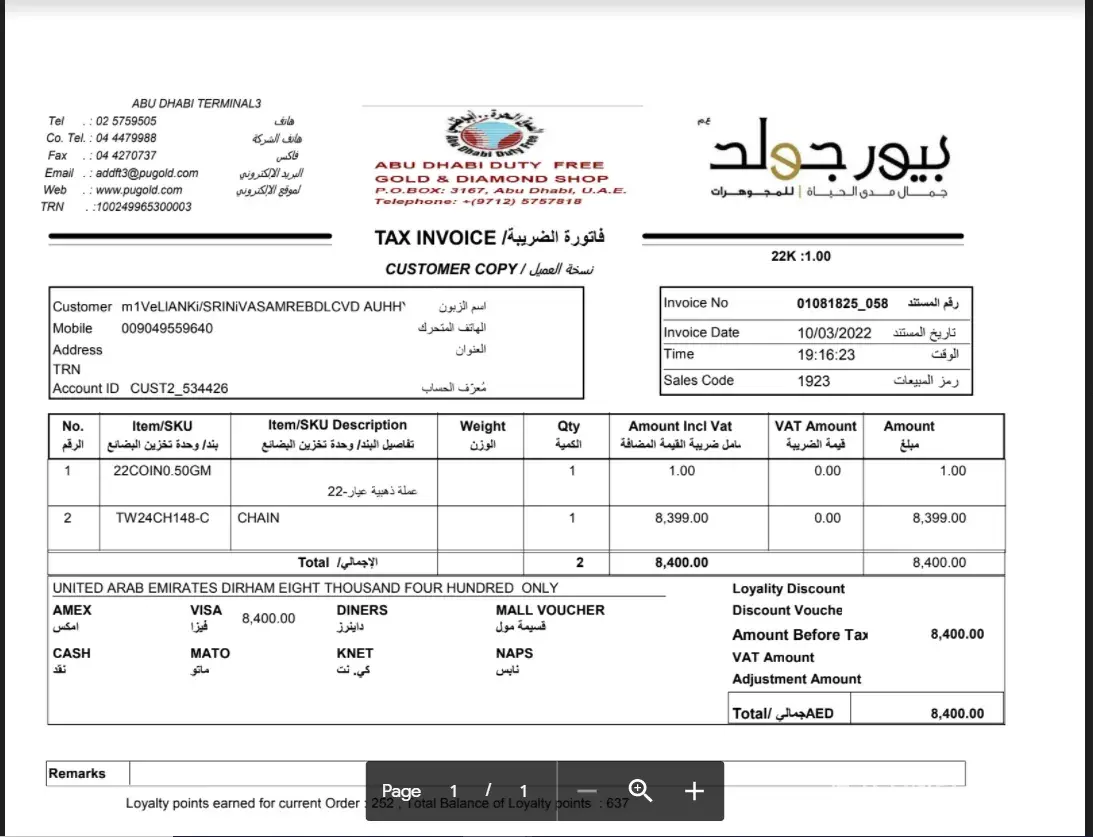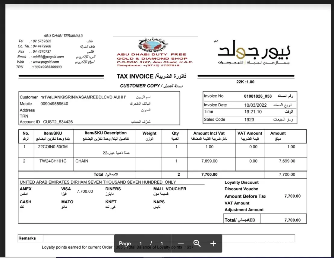 We have purchased 24 C gold at Abudabi airport on 11-Mar-2022 and please find invoices attached.