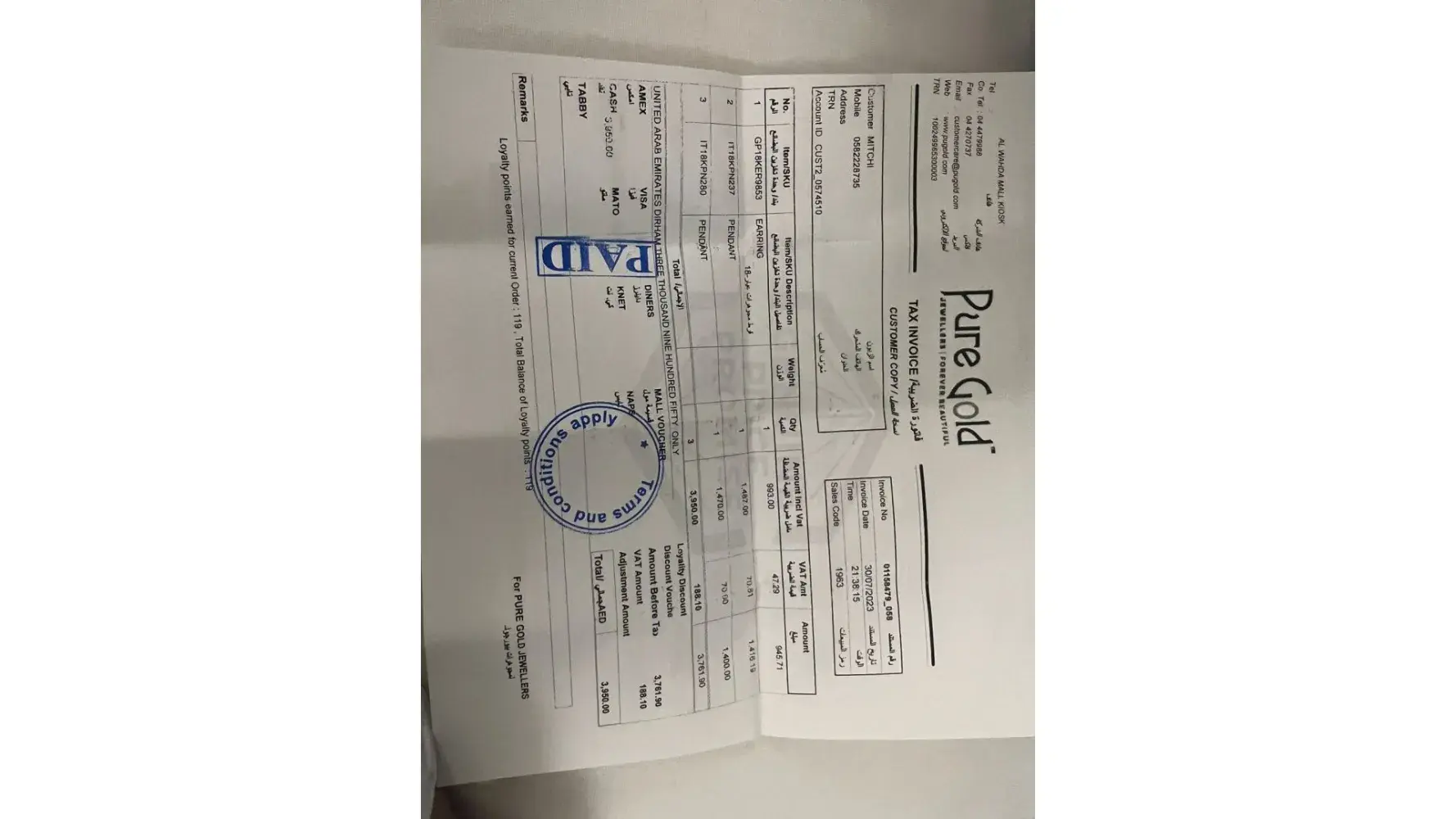 I was assured by your representative that I will be emailed an invoice on my email address which I provided but it is very un-professional that I have not been sent any invoice and hence proof of my purchase and weight of 1tola bracelet which I paid using my UK Halifax debit card ( worth £ 10555 pounds = 4999 AED . I requested twice and even went back to the store at the airport, but was assured that I will be emailed the said receipt. I could not go back the third time as my flight had to leave ! I have been scammed and I want a refund. I have been charged nearly double !