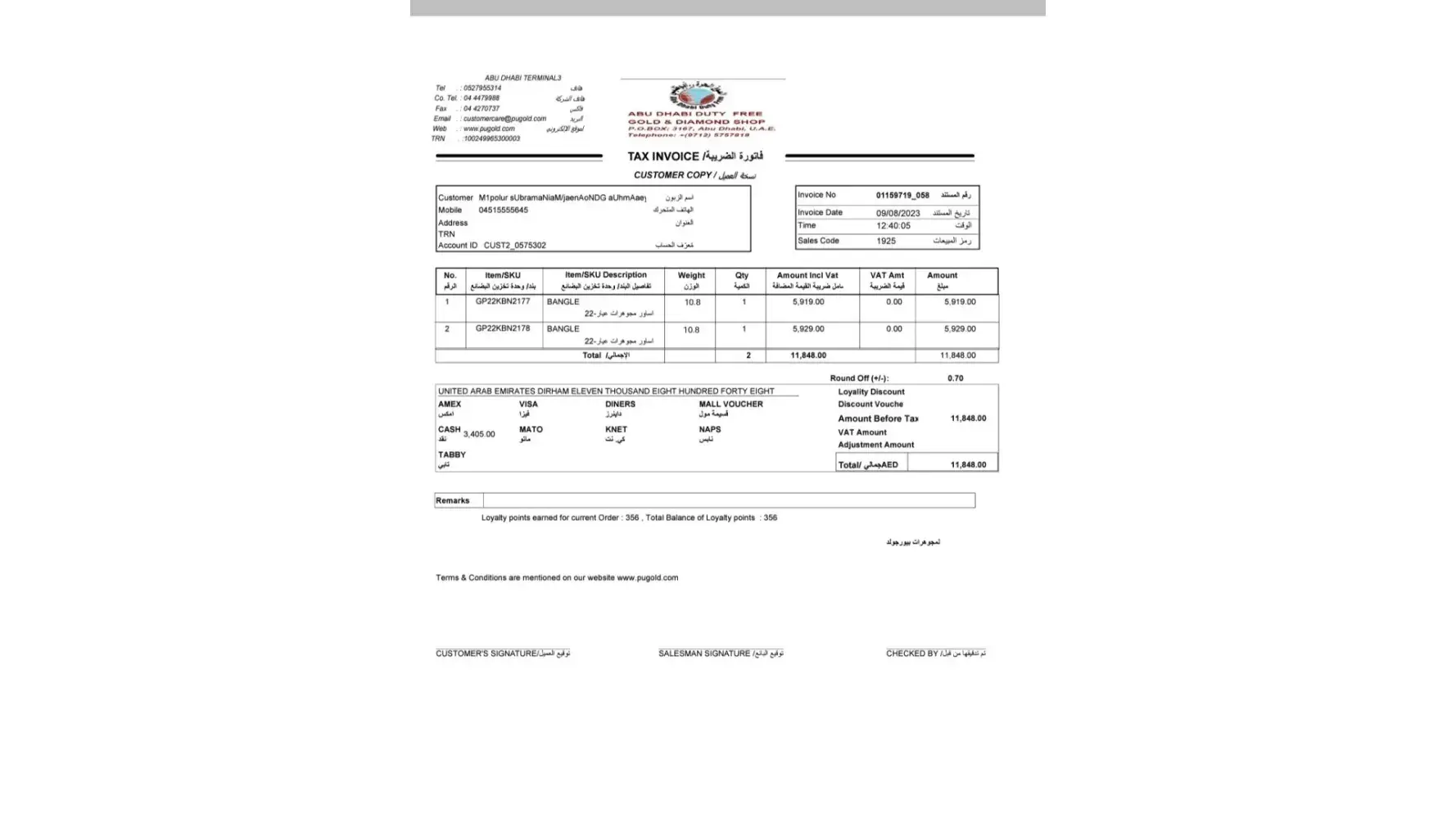 I had purchased 2 bangles from Pure Gold shop,Duty free shop,Terminal 3,inAbu Dhabi international airport on 9.8.23 I paid AED 11848 for it.They told 43 grams and no taxes & charges.I asked purchased invoice copy and they sent it to my email. I was very shocked, it shows only 21.6 grams total weight and charged 11848 AED.How did they calculate? The purchasrd invoice copy is attached for your reference. I am aged lady 63 years old and suffers lot of health issues.Now I am mentally disturbed.Please help me and to refund the balance amount to my Gpay Account .Phone number is