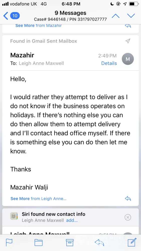 Problem 3 came to my attention as I checked my online tracker and saw nothing happening until August 7th when I noticed the package was in transit from the depot to the initial address. So I phoned again and begged the representative to contact the driver to return the package to the depot. She assured me that she had texted the driver and the package would be brought back and forwarded. Once again I foolishly believed the lies I was being fed by Purolator's customer service misrepresentatives.