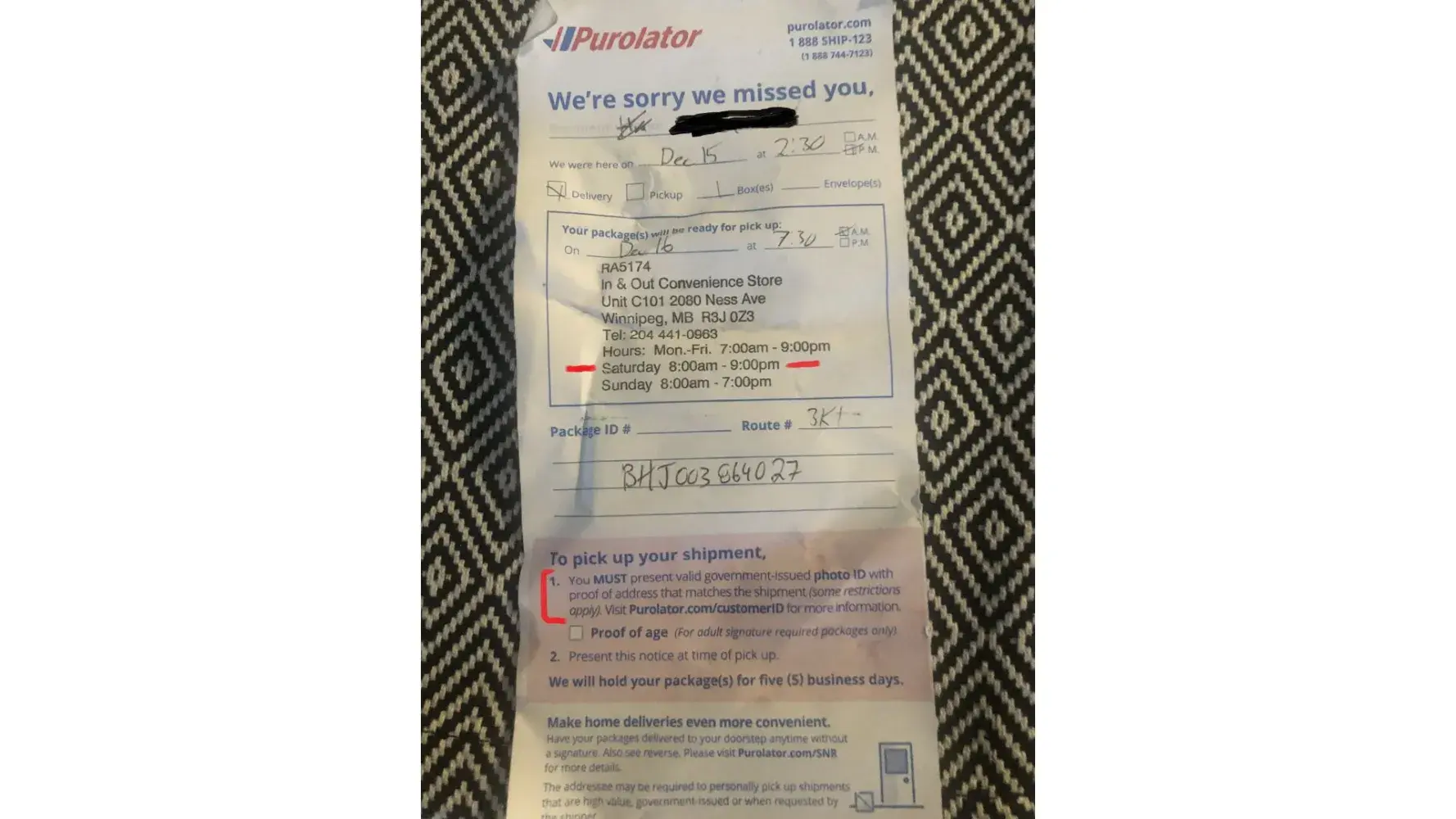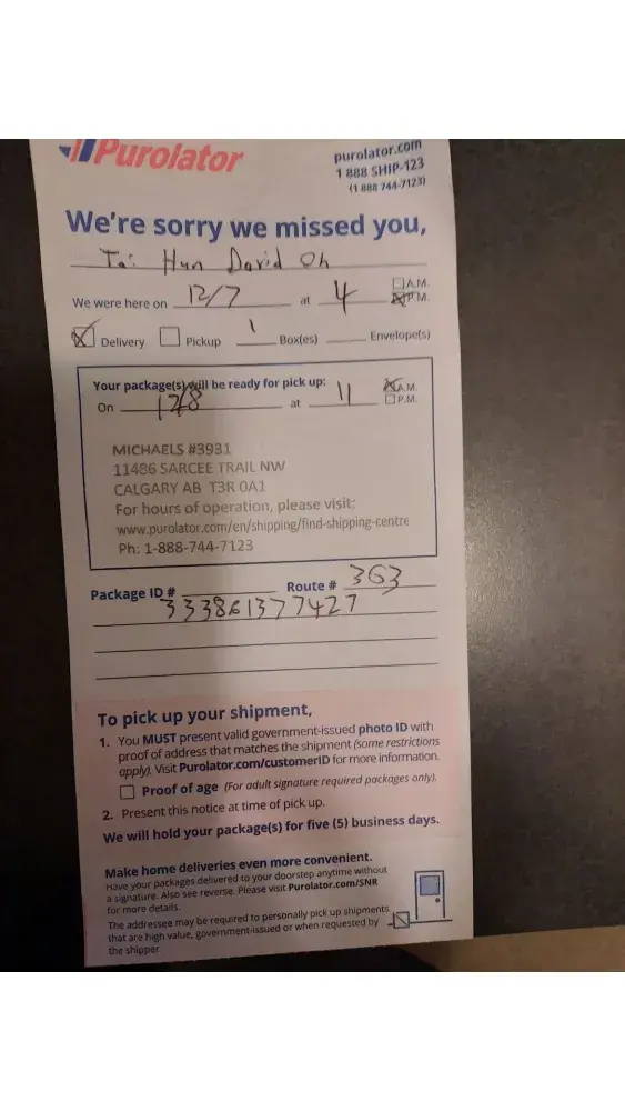 3. My in-laws were kind enough to go to the pick-up location to try and pick up my package for me, but when they got there, they were told that the ID presented needed to not only match the address on the package, but also match the recipient's ID, which wouldn't have been possible in any case since I don't live there. - On the "We're sorry we missed you." note, it does not specify that the name on the ID needs to match the package. If there are different conditions for different packages, it would have been better to direct us to check the Purolator website for what we needed to provide, in order to avoid unnecessary inconveniences. Desired outcome: Please put clearer instructions on the "We're sorry we missed you." note, even if it's "go to purolator.com and type in the tracking number to find out what we'll need from you when you pick it up."