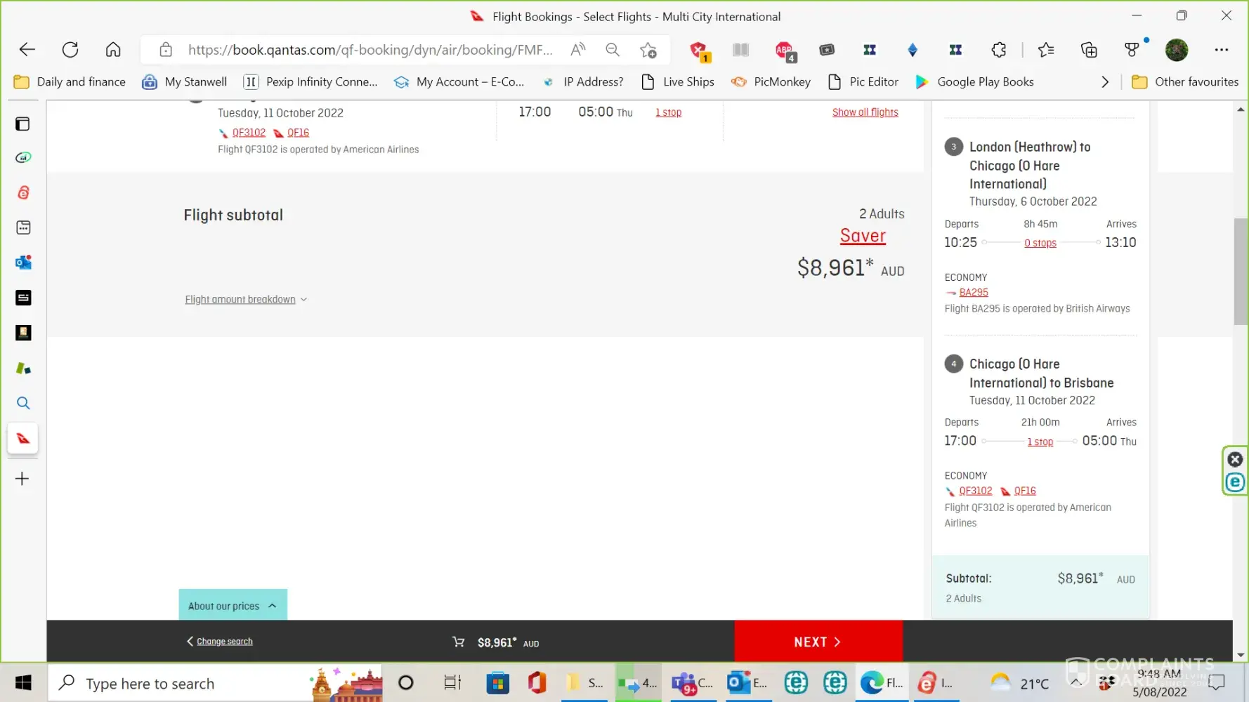 After staying away from the Qantas website for a couple of weeks (but checking using travel industry websites) I decided to go online and book my trip.