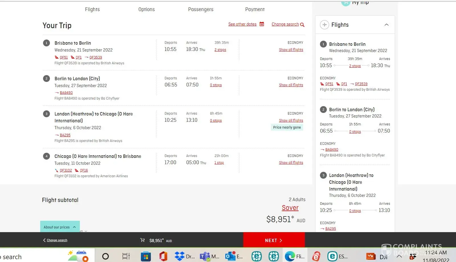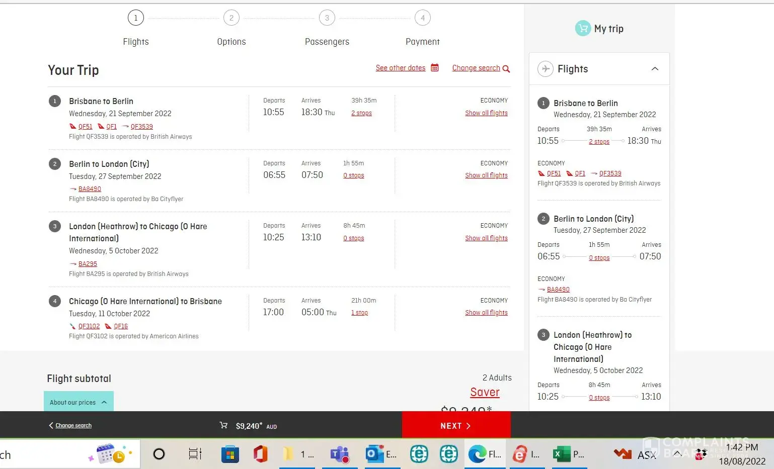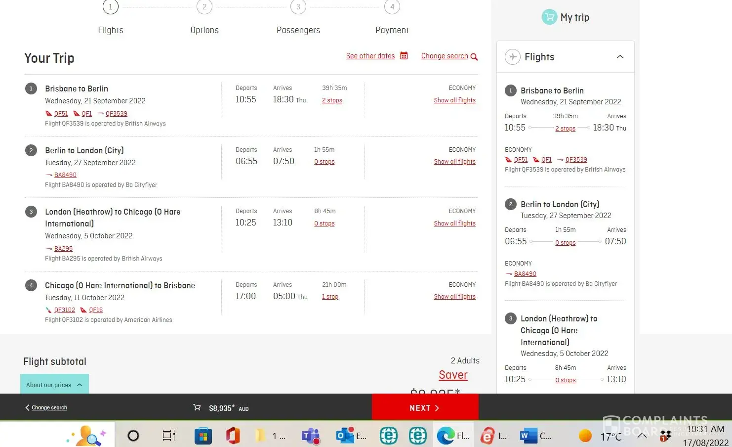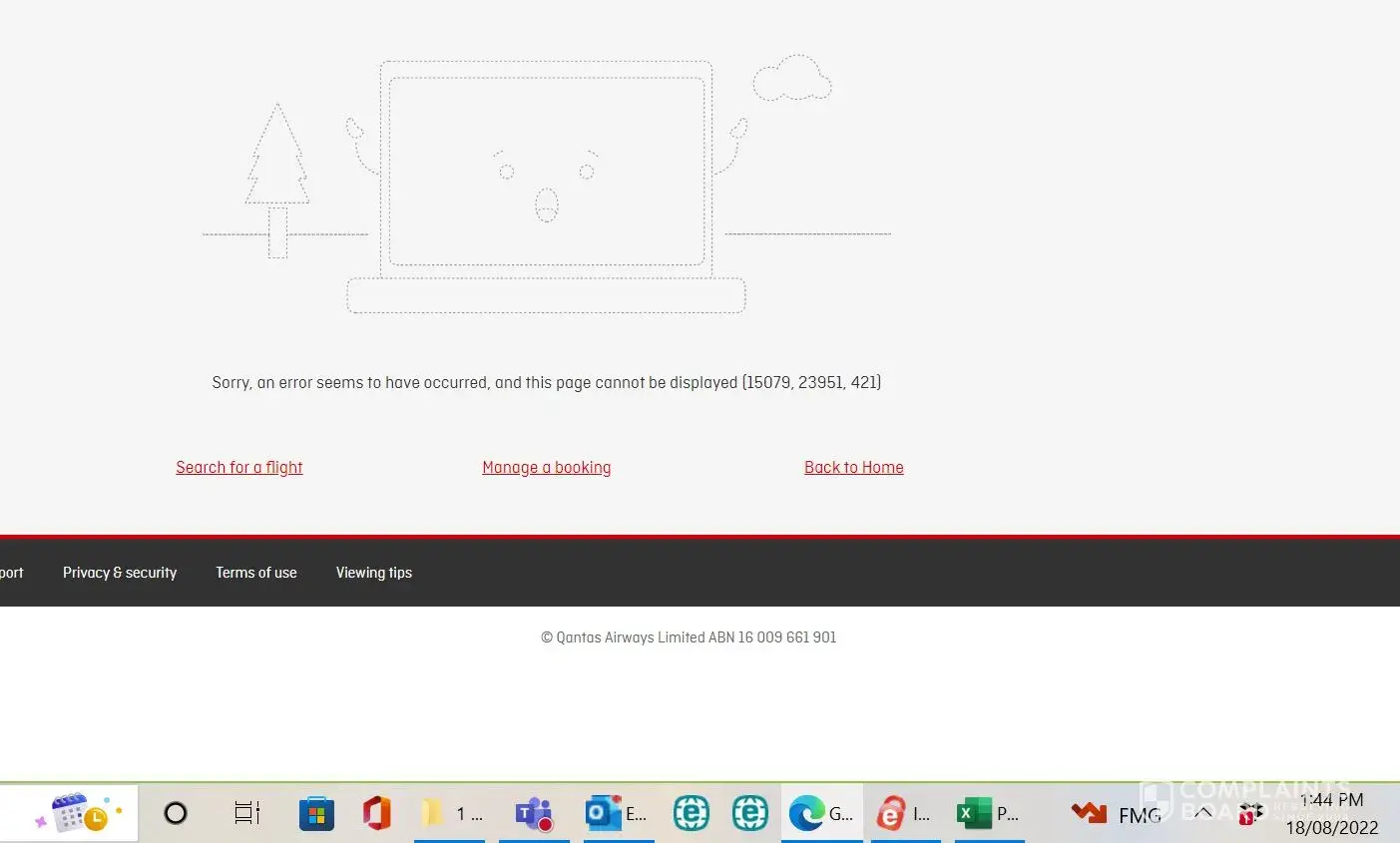 I logged on to the Qantas website, selected our flights (all showing as available) and hit proceed. Filled in all of our information and chose seats. Hit proceed to pay, only to receive an error message. There was no means of going back to the previous screen, no means of saving the trip.