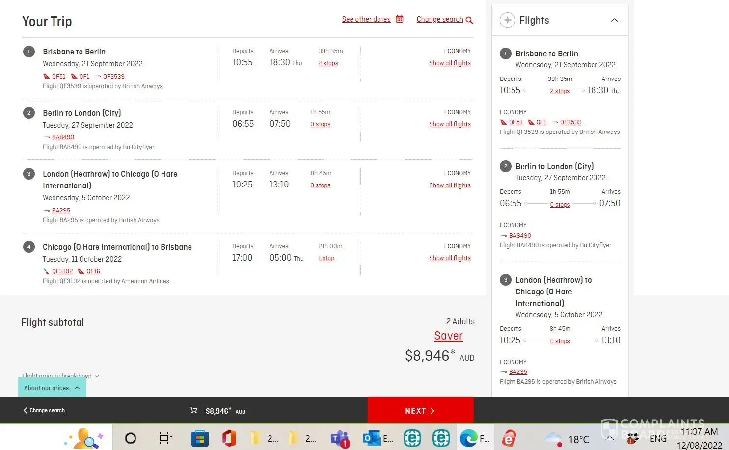So started again. Selected the same flights. Surprise, the cost had now increased from $8,400 to $9,500. Completed all the fields as before and received the same error message.