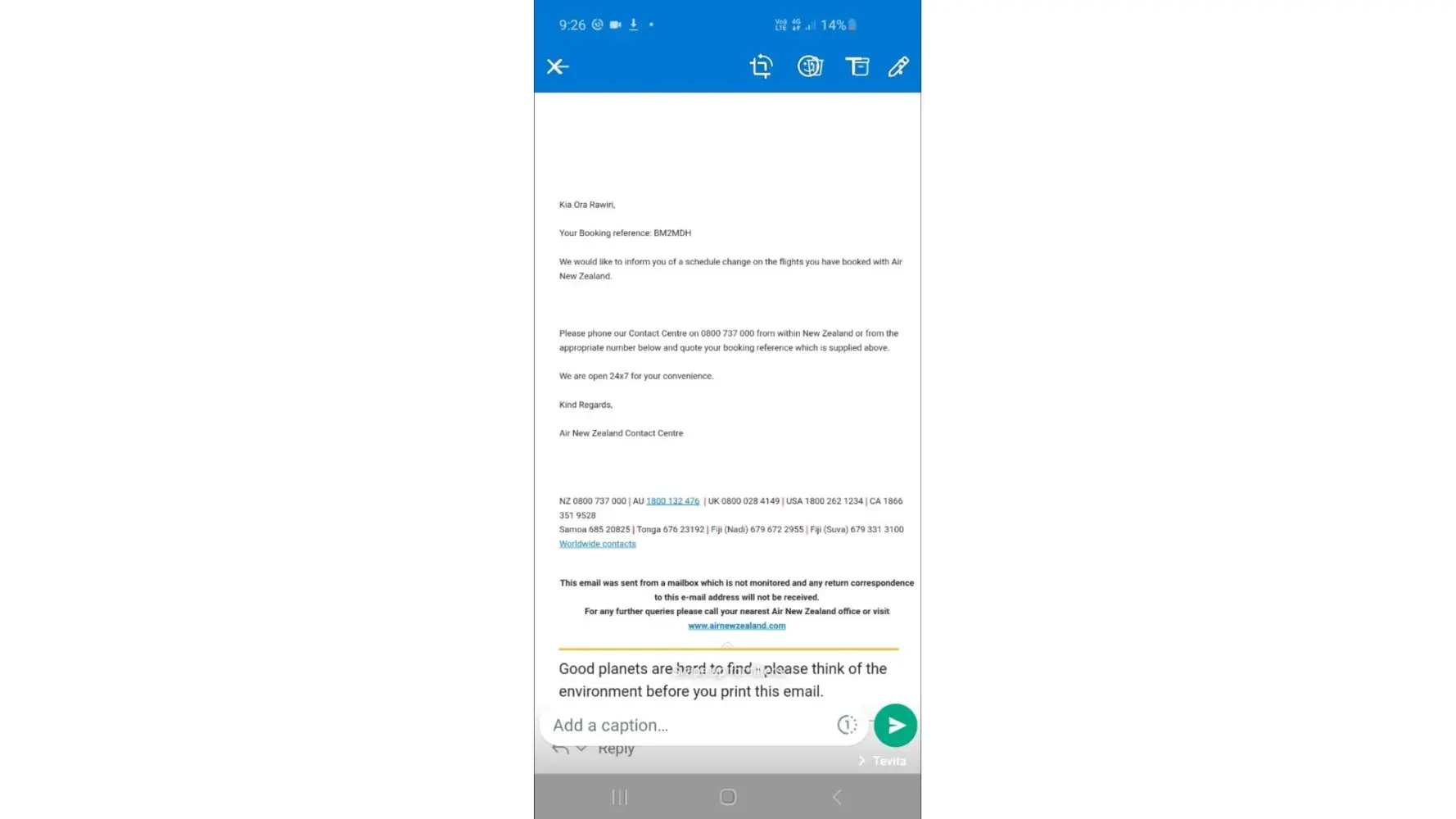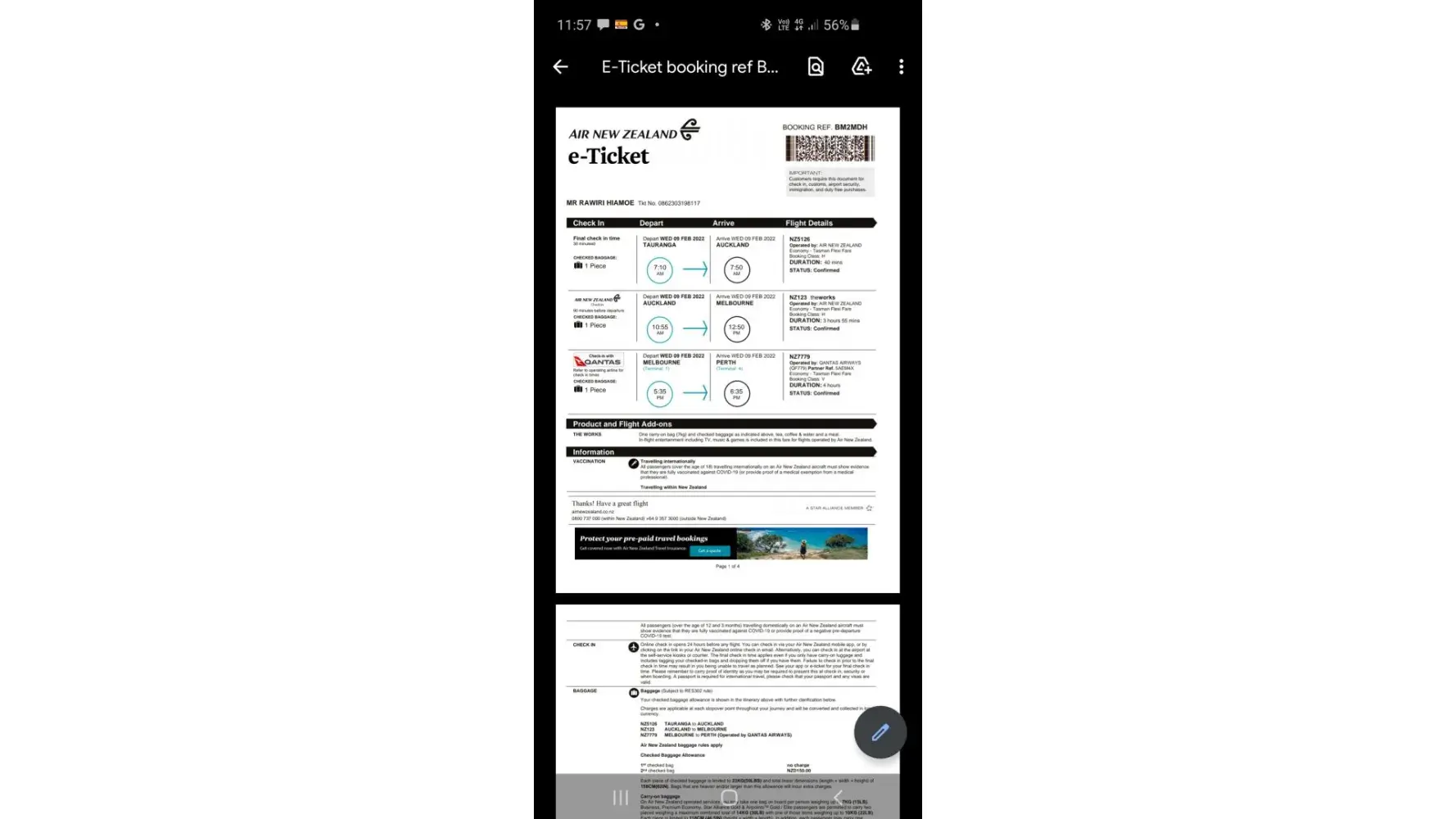 On Monday the 7th of February, we were advised that flight NZ777 departing from Melbourne to Perth, Wednesday the 9th of February at 17:35 for passenger Rawiri HIAMOE, would be cancelled. There was no explanation, no alterative and no compensation offered for the trouble and distress caused. Rawiri had taken a PCR test on Sunday the 6th of February, in order to be able to board from Auckland and fly to Melbourne, at a cost of $308. This test was then considered null and void, and no longer required, due to Rawiri being unable to fly on Wednesday the 9th. (Another test was required to be taken again days later to be able to fly on Friday the 11th of February at another cost of $308 to him).