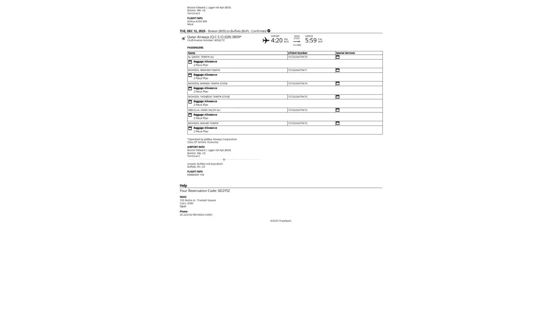For my trip and the request for financial compensation for the difficulties I faced, and because I did not catch the plane heading to Buffalo, due to the short transit time 1:50 Min, and because of the severe crowding at the airport, I did not catch my plane, which led to financial losses for me and my family members, and caused us fatigue and exhaustion due to the long flight duration