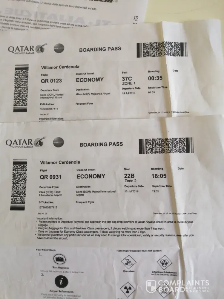 I am Villamor Villarta Cerdeñola which supposed to go back to Italy last July 18 from Mabalacat clark airport but I was denied to board the plane, reason was, i have an expired permit of stay.I presented additional documents to prove that i must be allowed go fly that day but the supervisor that day said they received an email directly from the italian immigration that i cannot enter italy with expired permit of stay (which i believe not true). I was then advice to give all the additional documents because that time the counter is closed, and iwas told to wait for an advice from the italian immigration. I was not informed nor received any call. After 3 days I went back to qatar office at clark and they said i will better apply for re-entry visa which i didn't do because the italian embassy advise me not to, i refuse for a rebook, so i bought ticket from another airlines and was able to enter italy without encountering any problem. With my experience with Qatar, i dont know if i will still choose or ask my friends to try qatar. My family is a afrequent flyer of Qatar, in the name of my wife # [protected]. Please help me and refund the money lost caused by this unfortunate experienced, i was allowed by italian immigragration to enter italy using another airline but not with Qatar as alleged by your supervisor in the ground on july 18, 2019. Thank you and hope for your action.