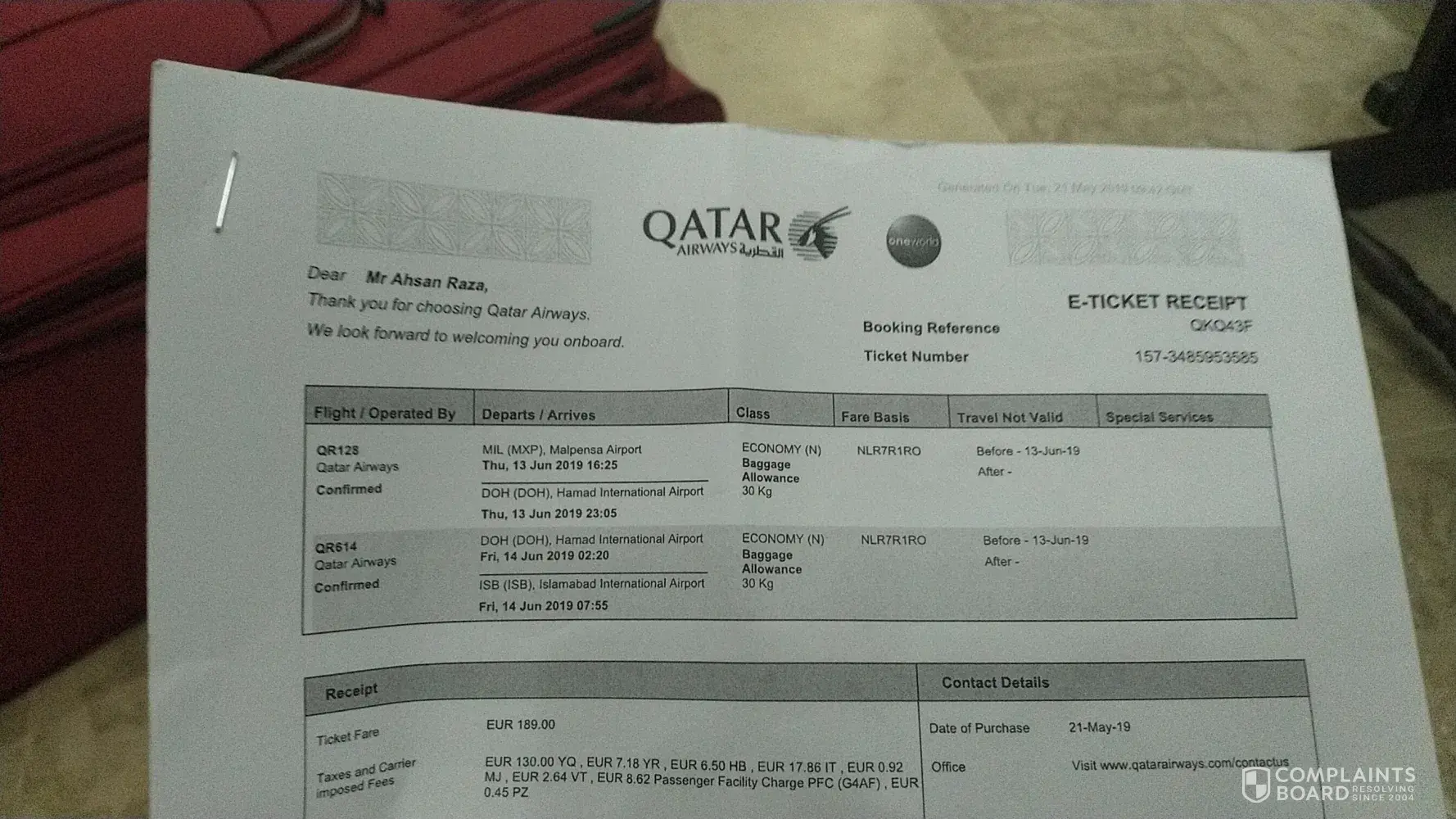 A group of 13 pilgrimage passengers traveling on 3rd July 2019 from Islamabad-Pakistan was mishandled by Qatar Airways Team at Check In, they were not allowed to board on plane, whereas, another group of 18 passengers traveling from Karachi-Pakistan was allowed to board under the same status/circumstances. My wife Mrs. Batool Fatima was one of the passengers from Islamabad on 3rd July, the confirmed bookings were made from Karachi on 26th June 2019, My Wife's booking details are with me i.e. Reservation code: SEZPHI, TICKET NUMBER: [protected]/37, the incident reported to Qatar Airways Team in Karachi by the Travel Agent in Karachi are copied/pasted as under: