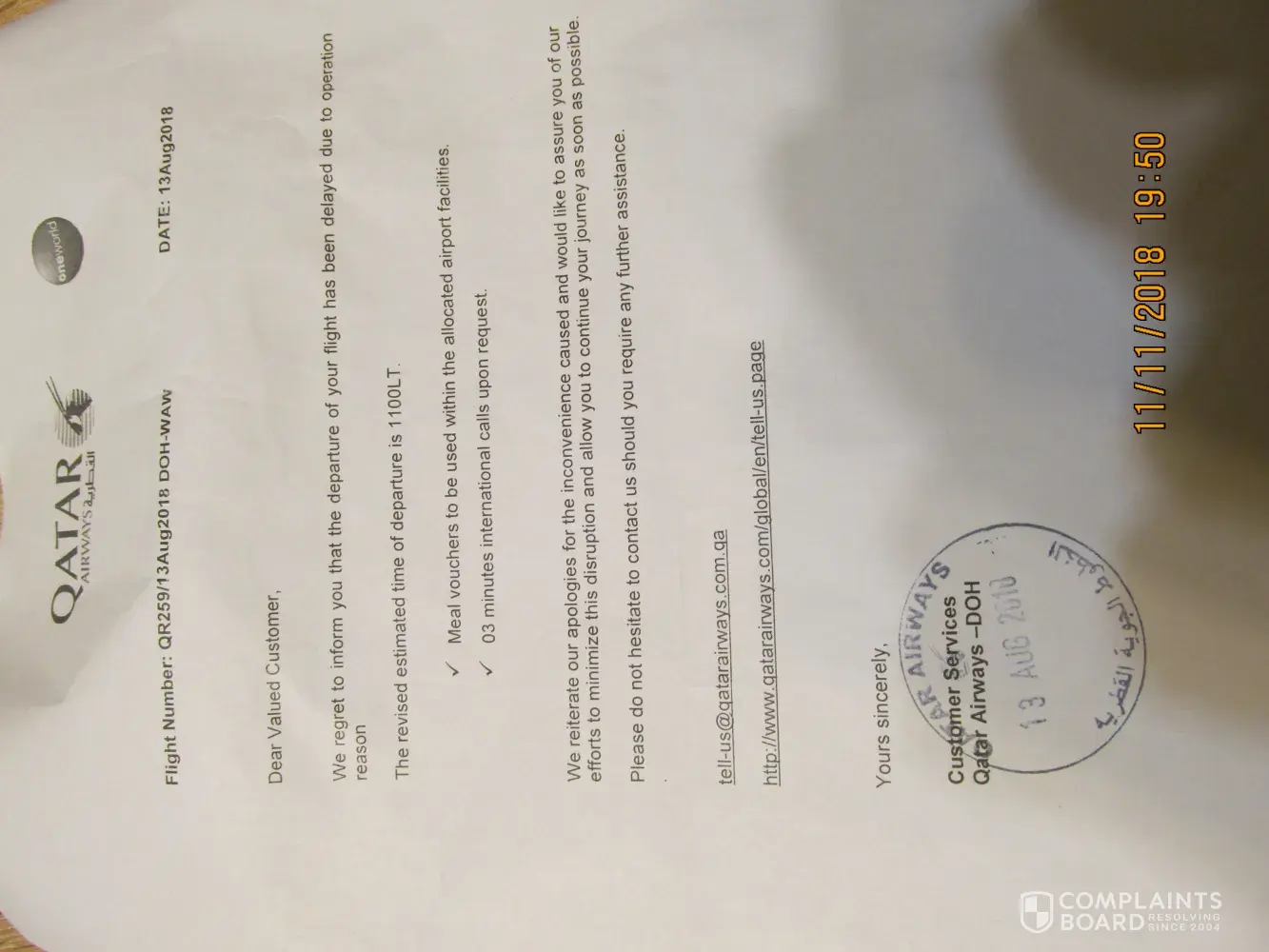 I flew to Warsaw almost 20 hours later. I should have landed on August 12 at 20.25 but landed on August 13 at 16:17 by delaying the QR 973 and QR 261 flight. My suitcase was destroyed. The stiffening of the suitcase was broken. I am asking you to pay the compensation of 600 EUR for a delayed flight and 50 EUR compensation for a damaged suitcase. In the event of a negative response to my complaint, I will submit a complaint on the Qatar airline to the Civil Aviation Authority.