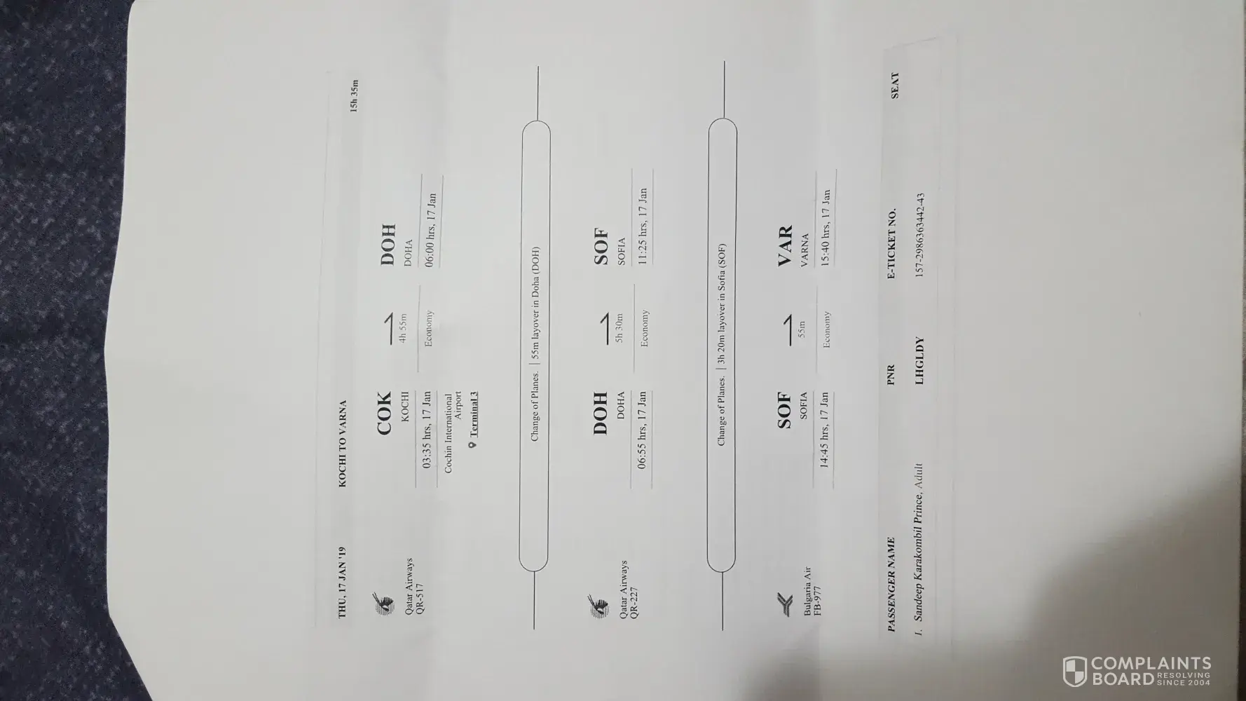 I am a medical student who travels from Cochin, india to varna, Bulgaria on 17th January 2019. My flight was at 3:35 am from Cochin even though the flight take off at the right time it takes about 40 min more to reach Doha there was only 1 hour layover in Doha and I need to catch my flight to Sofia even though my flight was 40 min late your respected officers were not there to take me to the next flight and I missed my flight to Sofia . I got stuck in Doha for 1 long day as there was only a single flight on each day . The main issue is that I had a university semester exam on the very next day and I missed that exam so now I need to pay money to appear for that exam in the next time .I know Qatar airways is the best airlines in the world and you will definitely give me appropriate compensation .So I kindly request you to accept this complaint expecting your reply