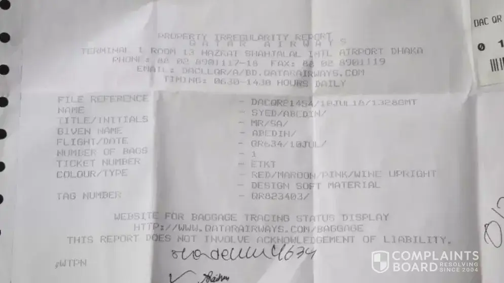 With regret this is to inform you that my family(wife, son-adult & daughter-infant) traveled from Doha to Dhaka through Qatar Airways flight number: QR634 on dated the 10th July 8:55am but one hand bag tag number: [protected] has not yet received. So my son Syed Raihanul Abedin already has reported for the missing property at your Qatar Airways, Shahjalal International Airport Office with the file reference: DACQR21454/10JUL18/1328GMT but as of now no whereabouts.