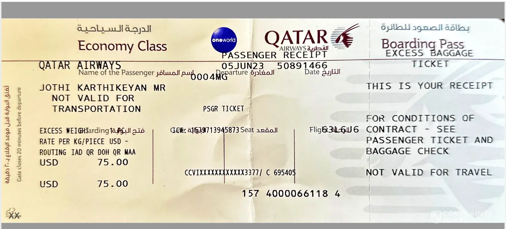 Dulles Airport - Excess baggage cost, dated June 6th - Qatar airways staffs rude behavior & no client centricity.