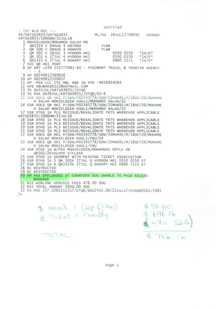 Salah MohiEldeen Khalil C/O Mr. Shawqi Khalil Al Koot Insurance Company PO Box 24563 Doha Qatar +974 [protected] Doha Cell number +249 [protected] Khartoum Cell number for Mohamed Salah MohiEldeen Khalil July 27, 2017 Qatar Airways Tower 1, Airport Road 22550 Doha, Qatar Dear Mr. Al Bakar REF: Hyderabad to Khartoum, QA 501/July 26, 2017 We love the Qatar Airways (AlQatarya) brand, which is why we are sending this complaint letter to your esteemed office informing you of the unfortunate incident our son experienced on the flight mentioned above. The material facts our son experienced clearly violate fundamental regulations and rules governing the international travel defined by Warsaw and Monteral conventions, yet, more importantly the culture and values of our beloved airline. I am struggling explaining the grim reality, experienced by our child, utilizing deception and manipulation resulting in a denied boarding nightmare. Consequently, we incurred extra expenses purchasing new ticket, transportation fare to and from Rajiv Gandhi International Airport, hotel accommodation etc. We do not wish to linger on our perception and sense of indignation. Yet, our child was denied boarding of mentioned flight, as documented in comments stated in his PNR ZS4XGV, still, incomplete failing to report amount of excess baggage weight & amount that was charged. Nonetheless, Mr. Mohamed Abdulraouf the counter supervisor of Qatar Airways in Hyderabad airport, documented our child was offloaded due to excess baggage requirements. We do not wish to cloud your undertaking this matter with 2nd party factual of “he/she saidâ€. Mr. Abdulraouf denied our son the 7kgs carryon, and personal laptop (HP Pavilion x360 15T Touch, weights 6Ibs, and approximately 15†X 9†in dimension). He continued to speak English when our son attempting to discuss methods to reduce alleged excess baggage to catch his flight which was reserved and planned a year ago resultant to his graduation and family member wedding. Mr. Abdulraouf had our son’s Sudanese passport, shockingly refused to engage his conversation in Arabic, irresponsibly determining to offload and cancel his flight. The “14 CFR Part 250†relating to airline over sales†refusal to board including racial and ethnic profiling as stated in “Travel Law Åš2.06(6), (see Flaster/Greenberg P.C. v. Brendan Airways). In general, denied boarding is defined – Refusal to accommodate passengers on a flight although they have valid ticket, a confirmed reservation on the flight – presenting themselves for check – in – within required time limit as stipulated. We imagine the same questions are racing through your brilliant mind as were racing through ours on that fateful day: