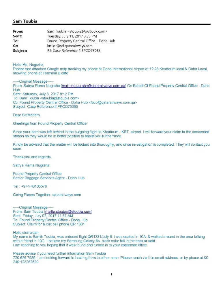 On July 9, was able to track my phone via Google GPS at Doha terminal B, immediately took a taxi to Khartoum airport meeting Qatar Airways luggage representative and forwarded the information to your office. after twenty minutes I locked the phone and set the alarm believing that a representative from your office would immediately respond to terminal location identified in the map and responded in due diligence to find the phone. Surprisingly a response was sent on July 11, 2017. Thus, no one responded when informed of the location.