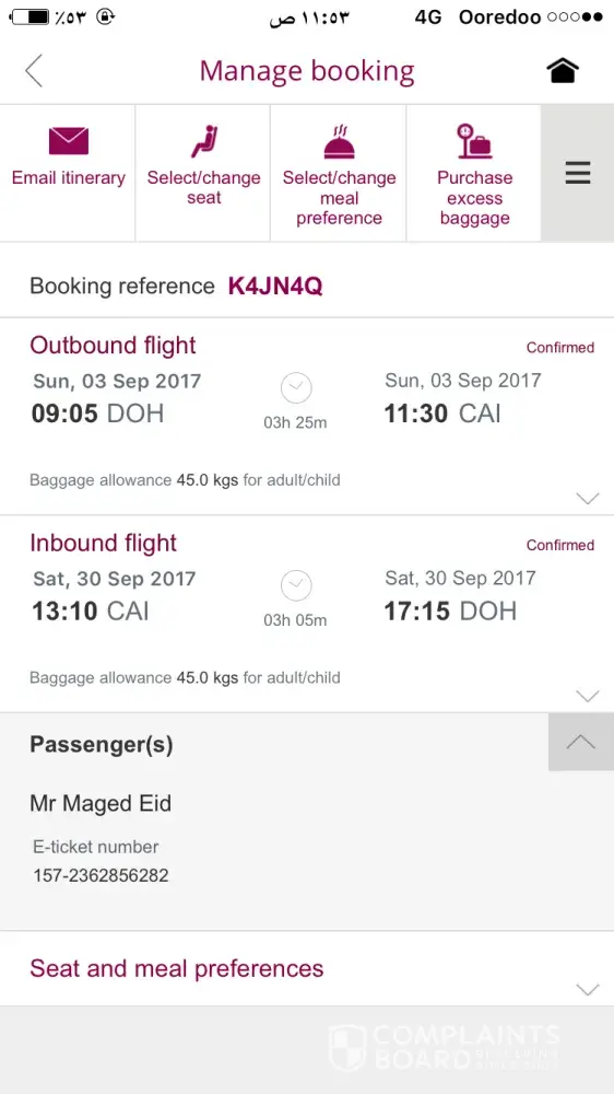 I booked our flights with Qatar airways from (Dallas-USA) to (Jeddah, Saudi Arabia) round trip with separate booking references. mine: [removed]: QR# L8B5G9 and my wife: [removed] QR# L7NKTH. however, we came from Dallas to Jeddah in the same flight, as you can see in our bookings details, and I booked deferent flights for Jeddah to Dallas, mine was on July 12th and my wife on August 29th.