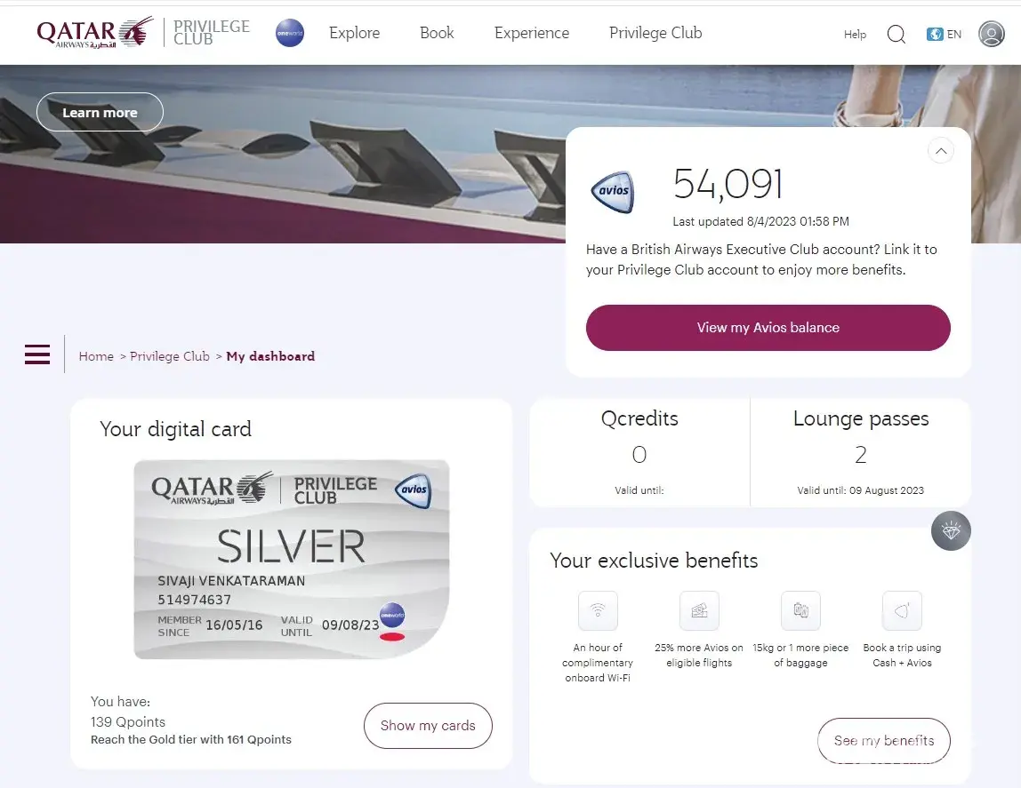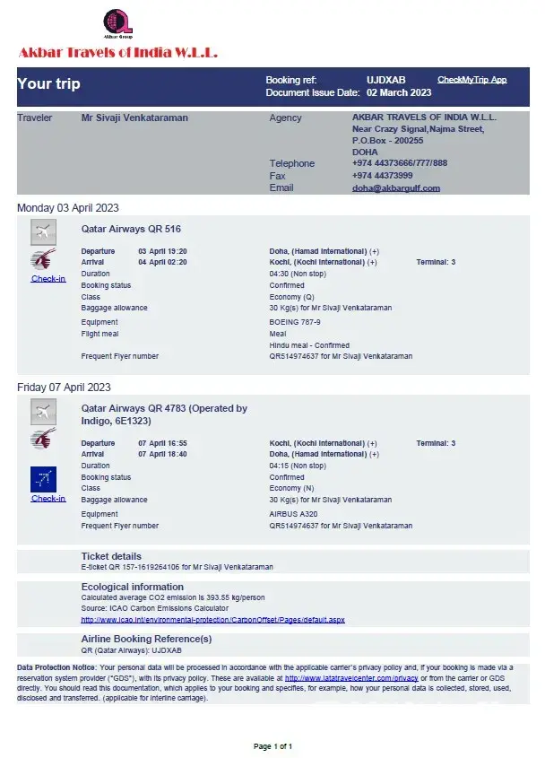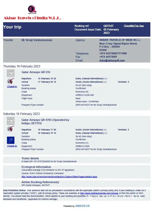Name : Sivaji VenkataramanQID : 26835626307Contact # : 33302658Qatar Airways Privilege / Silver Club Member [protected]Â Â