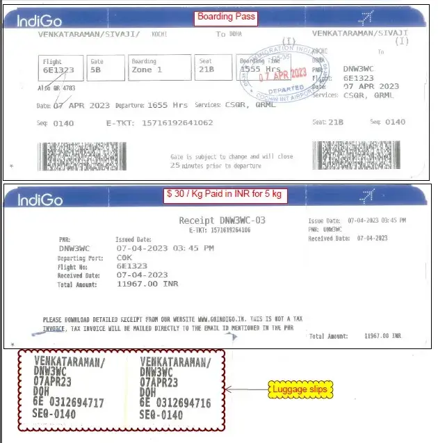 As per the above details, when I travelled from COK to DOH on 7th April 2023 Eligible amount of additional luggage ( 15 Kg in Qatar Airways & 10 KG additional in Indigo as per the understanding in between Qatar Airways and Indigo) was denied to accept by check-in counter staff and Manager as per the privilege allowance and forced to remit the luggage charges  ₹ 11967. ( Receipt attached for your ready reference)
