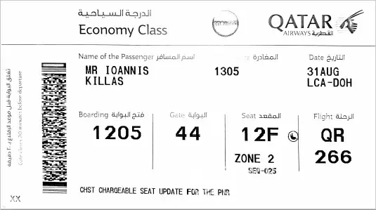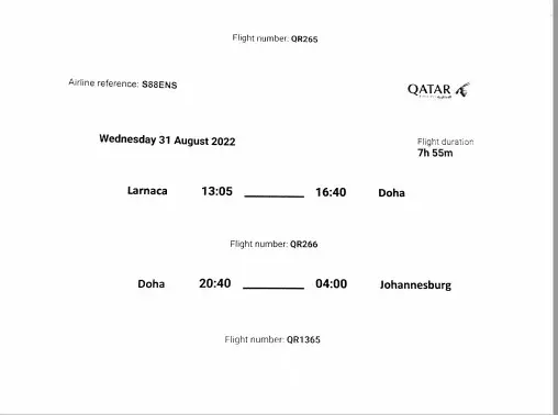 Please be advised that on the 31st August 2022 my wife and I were booked on flight QR 266 from Larnaca Airport to Doha and thereafter from Doha to Johannesburg.(copy of boarding pass attached).