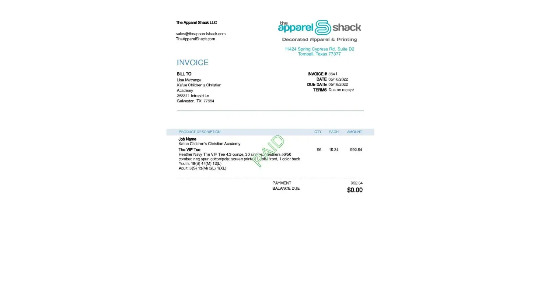 There are $992.64 worth of custom printed t-shirts in this bag for our camp (see attached receipt & Picture of the bag) and various camp supplies and books. This bag is still missing as of this compliant submittal.