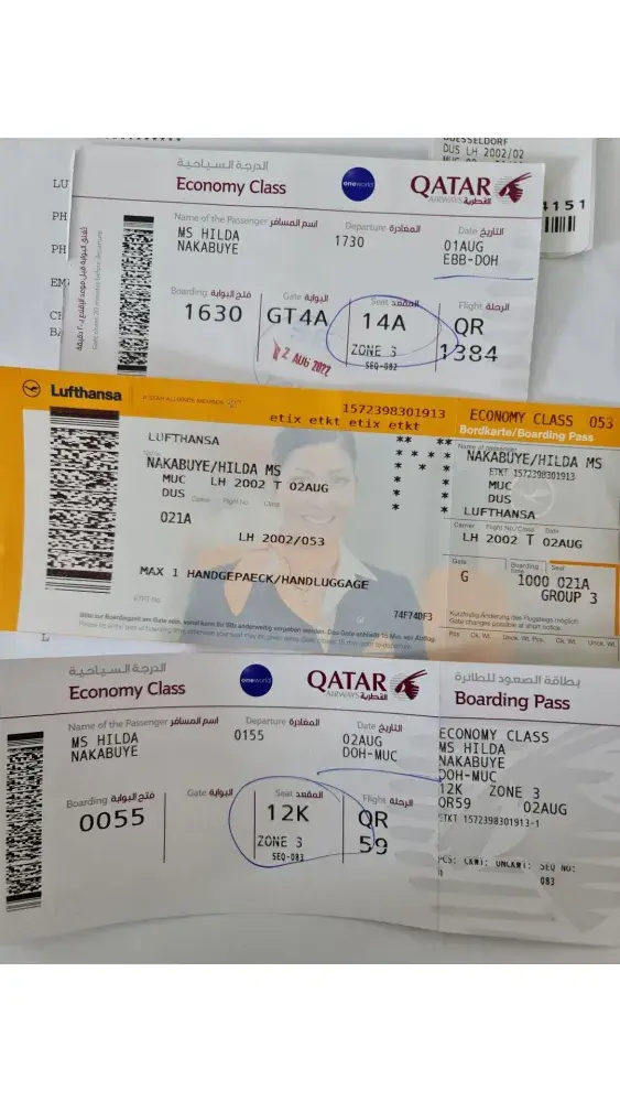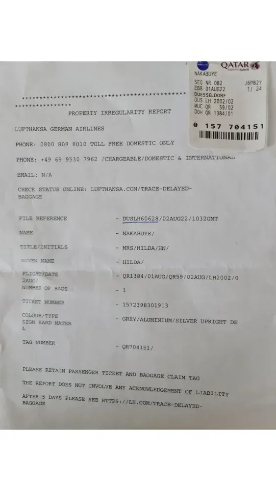 My names are Hilda Nakabuye and i flew from Uganda 01. August 2022 with Qatar Airlines and reached in Germany with Lufthansa but i didn't get my suitcase. I reached in Düsseldorf Germany on 02 August 2022 until now i haven't gotten my suitcase and there were my favourite Parfumes and my best clothes because i had gone on a wedding to Uganda.