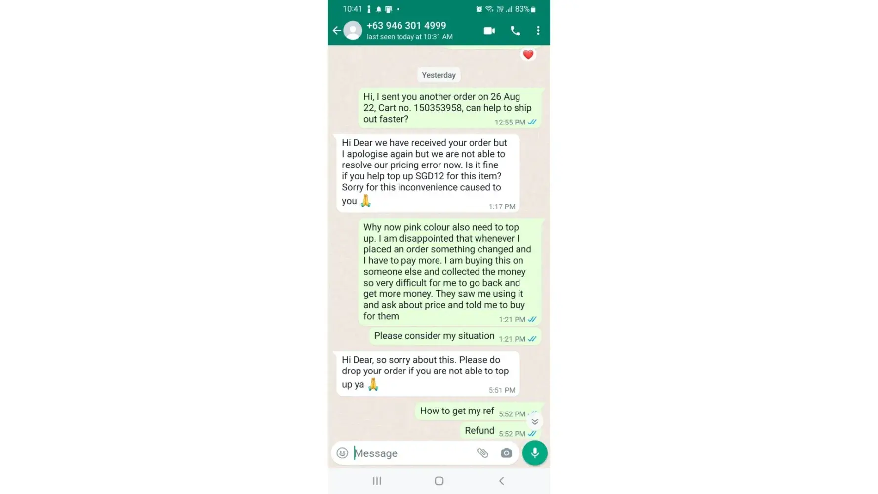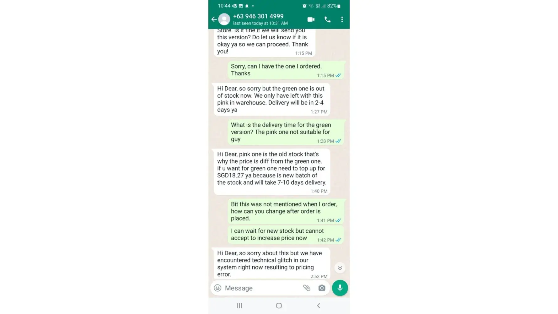 I made another order on 26 Aug 22, this time for the pink colour version. I followed up with them on WhatsApp three days later and was told I must top up S$12. The reason provided both times is they are having some technical glitch and are unable to resolve their pricing error.