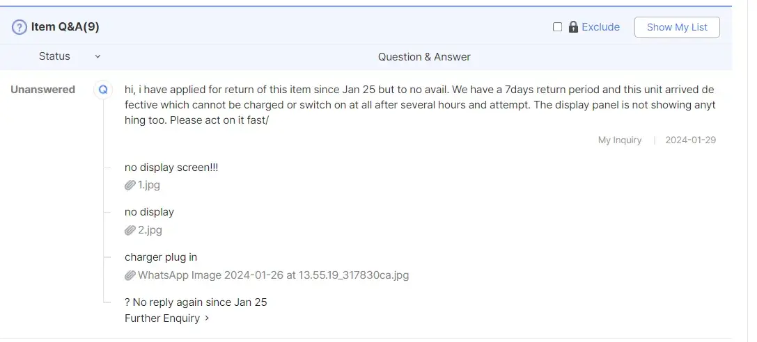 * Understand that there is 7days refund and seller is not responsive and poor in customer support, thus seeking your help since I bought from your platform and reaching the validity date soon which is Jan 31. I only want to refund as its a brand new product and yet received a defective one.
