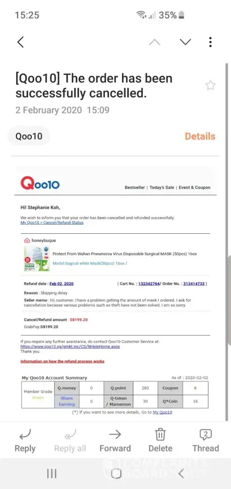 They gave theft as a reason for the order cancellation on 2Feb2020 which is not acceptable as the Qoo system updated me the order status as "shipped out" on 31Jan2020. Yet 1 Feb 2020 they were still selling it @$35.90 each. So I don't understand as my order was already shipped out 31 Jan 2020 and 1 Feb the seller still can post on Qoo selling the product. If the reason is theft then it should not affect my order which was already shipped out.