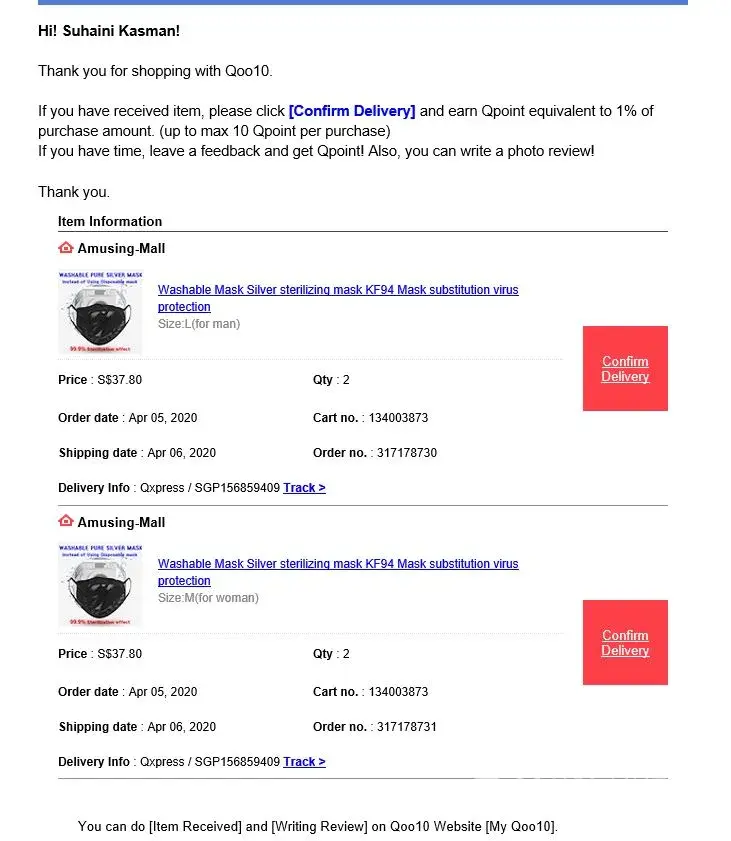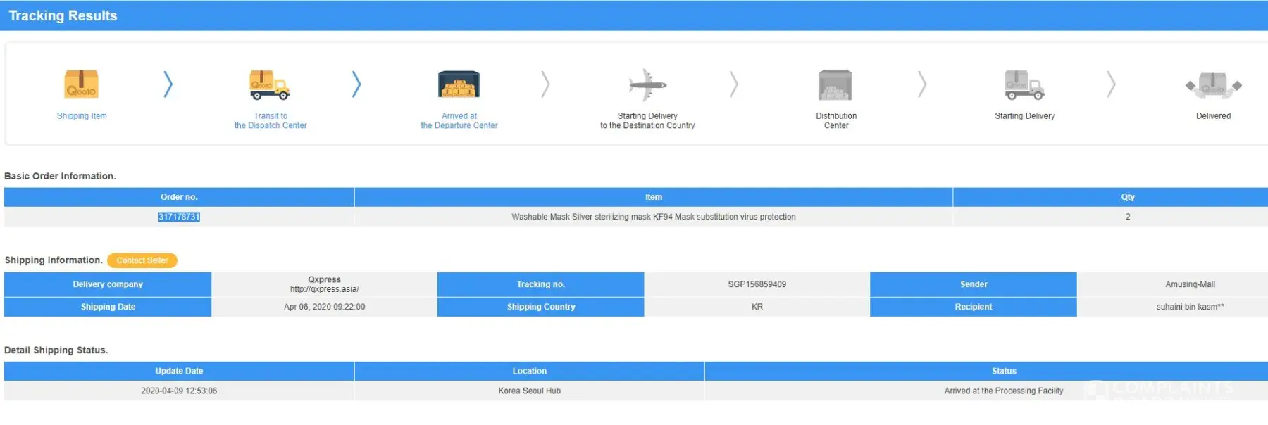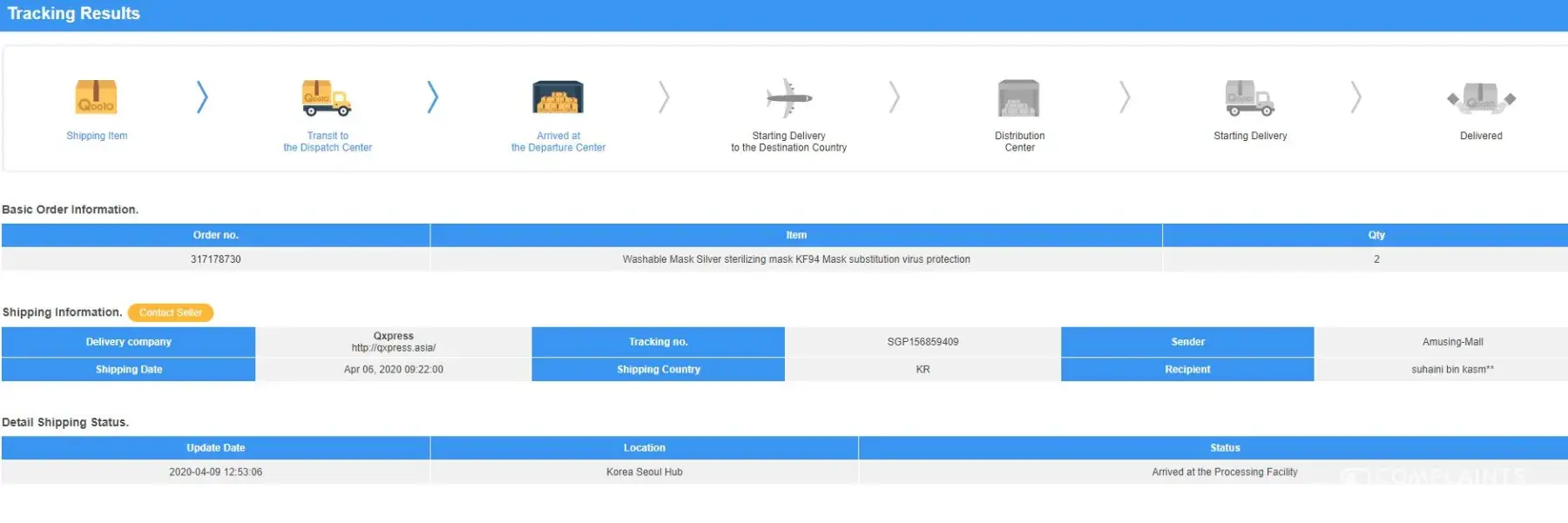 I'm very disappointed with your vendor Amusing Mall frm South Korea. I ordered 4 washable masks ( Order No : [protected] & [protected] / Tracking no : SGP156859409 ) from them on 5/4/2020 but till today(20/4/20) 2 weeks later and still not received my 4 ordered items worth SGD80. I'm not amused totally. Are they genuine seller or are there problems with shipping out the items frm seller. Already tracked my items but it said Arrived at Departure Centre in South Korea.No departure frm South Korea Airport till today(20/4/20). I already send my enquiry to seller on 12/4/20 but they replied items was sent to departure centre on 6/4/20. Please help. Thanks.