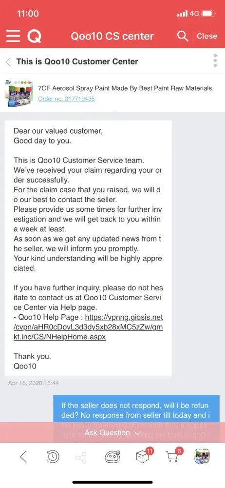 I am writing to complain about a dishonest act by a seller and also poor customer service from qoo10 helpdesk. Ordered 2 cans of spray paint from seller, Umistrong Art Store on April 12, 2020. Only 1 can was sent on April 15, 2020 and straight away, I informed seller that only 1 out of 2 spray paints was sent. No response afterwards and wrote in to qoo10 on April of 16, 2020. Continued to seek response from seller and customer service after a week and still no response. Was told by customer service that it would take a week at least for a response. But, till today no response was provided. Really upset with customer service recovery for qoo10. No options given and no attempt at trying to recover customer's trust. It's not about the value of the item but it's about business etiquette and I surely do not want other buyers to be scammed. How are customers going to trust the platform again if in such a situation, no help is rendered? I would like to be refunded for the one can of spray paint which was not delivered to me.