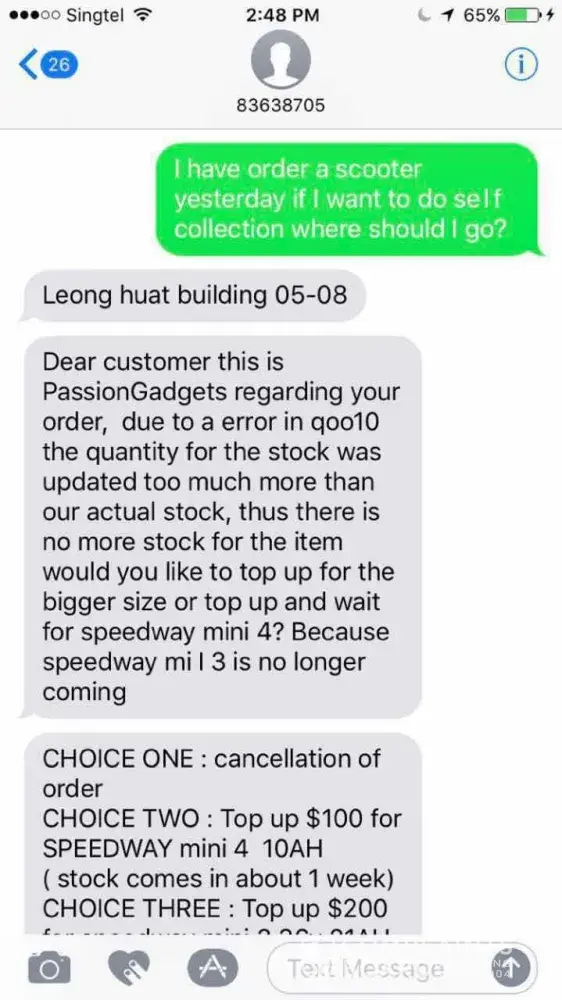 I have bought a Speedway Mini 3 escooter on 6 April 2017 from Passion Living during the sale at $329. I have msg the seller that I will be coming down on the following day for self collection and have agreed on the timing and place of collection. However, on the day itself, Passion Living drop me a msg saying that stock is not enough as there is some problem in qoo10 system. I was given an option to top up another $100 to upgrade to another scooter or being refunded. This is unprofessional of them as there was already an agreement being done on Qoo10 on the scooter with the agreed amount.