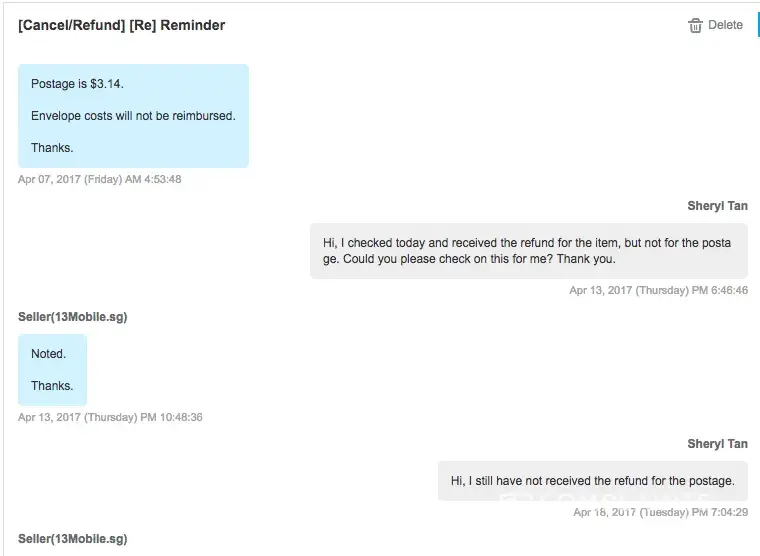 I requested to cancel and exchange one of my orders from 13Mobile.sg when I received a defective product. Somehow, the seller decided to treat it as a simple refund case and did not send me a new product. No matter. But now, they are refusing to refund my postage as they clearly stated they would do. It has been 2 weeks since I returned the parcel and I have still yet to receive any meaningful response from the seller that indicates I will get my refund as promised. I would like my return postage to be refunded.