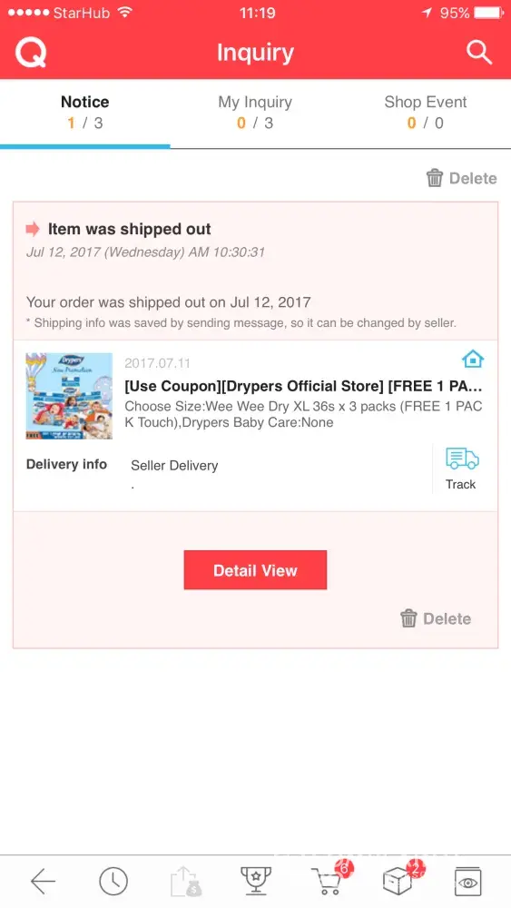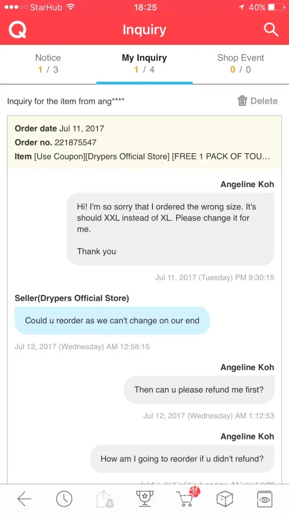 I ordered diaper at the diaper on 11 July 2017, after 10-30 min I realised that I ordered the wrong size. Immediately I went to the Q box to send a message to the seller and wanted to asked for a change of size, from XL to XXL during item is requesting.