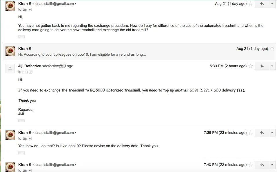- I was unsatisfied with the quality of product and wanted a refund. The Qoo10 side said that refund was possible but [protected]@[protected]@sg (an email of JIJI Sports) said it was not possible. I called the company up and they admitted that the qoo10 website was NOT run by them? How could this be? How can a company not be in charge of their own website? (See picture)