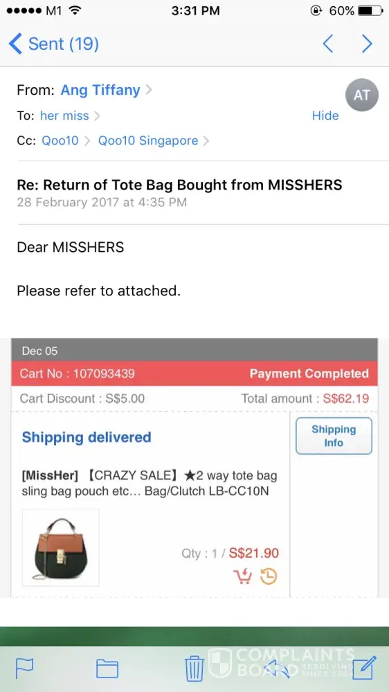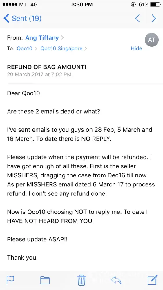 I've bought a bag from MISSHERS (via Qoo10) and item was delivered to me on 7 Dec16. On 8 Dec17 as there are alot scratches on the metal clip, I immediately requested for a refund. MISSHERS took donkey days (each time) to reply me. But the time she asked me to submit the request, its past 7days grace period. I kept bomba-ing her and she requested that I sent email ([protected]@hotmail.com) to her for the refund request. Fine, I sent and decided to cc: qoo10 customer service and info in my emails.