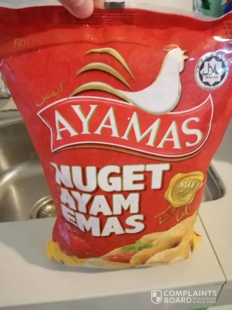 Bought 1 ayamas golden chicken nugget bag at 99 Speedmart at Sunway. Mentari on 9/12/19. When I bought at the store, the condition of bag was normal and took from fridge. The duration time from store to house is 5 minute only and I stored in freezer immediately went home. However on 21/12/19, i took the ayamas from freezer but the bag is filled with higher vacuum which it is not normal. I do not open this pouch bag because it have high risk of food safety. Please investigate this and come back with me with your investigation result & your corrective action at my email.