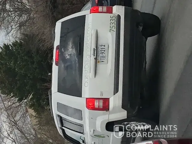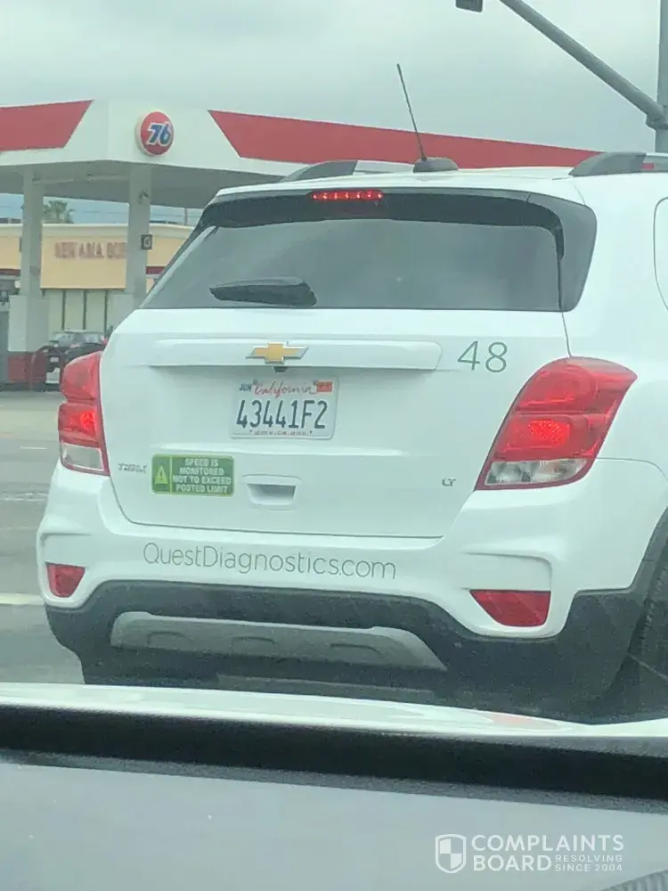 I was at one of locations where your drivers stop by to pick up blood works for your lab at Lakeside Medical Associates on Rinaldi Blvd. As i was picking up a patient myself and as I was ready to pull out of the facility I would haveto go around the building through the back parking lot where Quest Lab drivers park for their pick up. It is a 5 mph parking zone and all of a sudden your employee reversed back from his parking at a alarming speed wherehe almost hit my vehicle with the patient in the back. Doing so he made me press hard on my break and he continuously continued his route at high speeds and exiting the lot he made a illegal left turn onto Rinaldi toward Laurel Canyon. I barely got the chance to take a picture of the vehicle on my phone at the intersection. Vehicle plate number was "43441F2" white Chevy small suv. On the back said number "48". I believe it's the vehicle ID#.