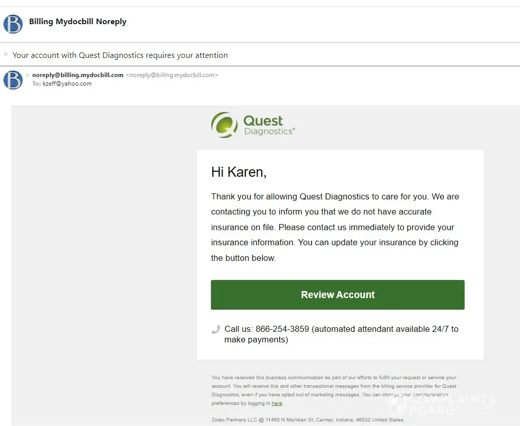 I just received an email titled "Your Quest Diagnostics Invoice for Lab Services is ready - Action Required in 5 Days saying "Your bill is ready:..."