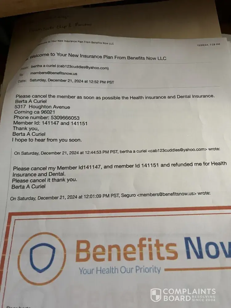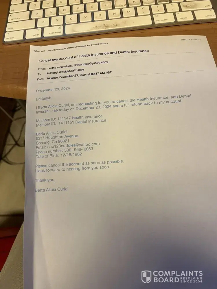 On December 12/2124-12/23/24 I had contacted through email through [protected]@quickhealthcare.com, and Seguro [protected]@benefitnow.us, and asked a representative agency to please cancel the two accounts of health insurance, and a refund for $273.74 back to my bank account of Tri Counties Bank. I had given them all the information to closed the account as soon as possible, and a refund as soon as possible as of December 23, 2024. The company never responded back to me about that the account has been closed and to let me know they have refunded me that amount on my account at Tri Counties Bank.