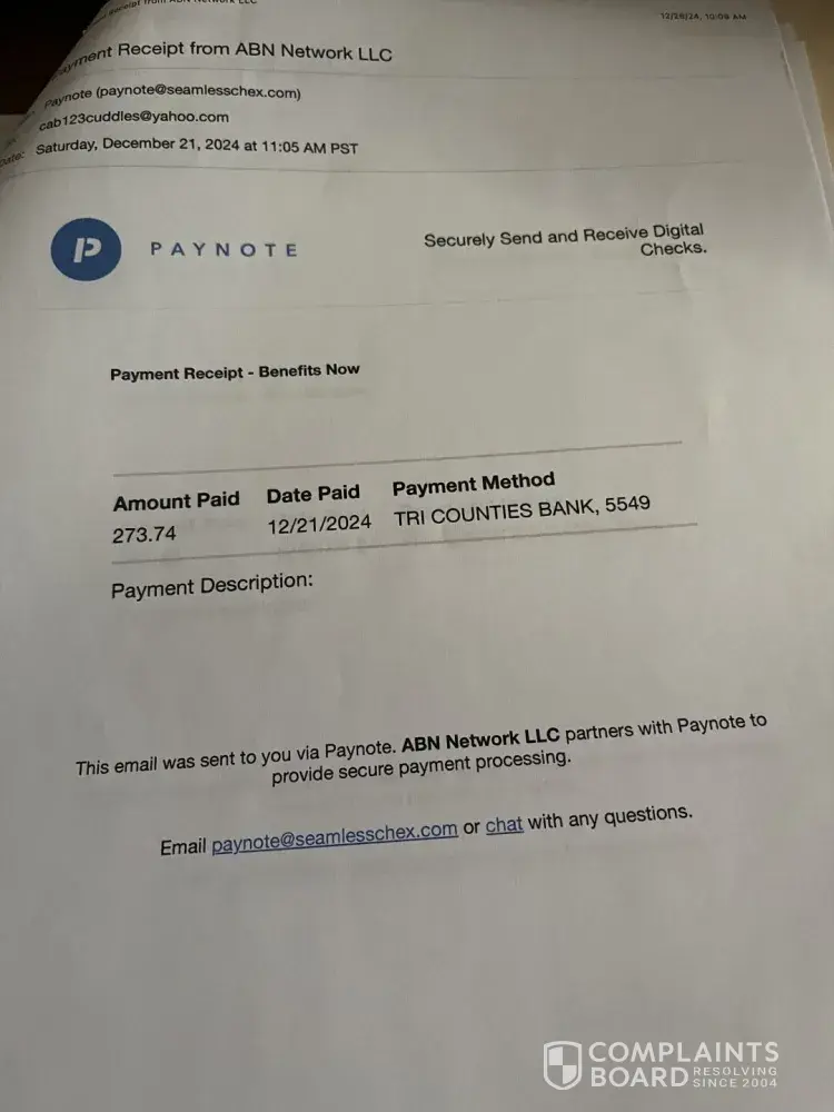 On December 21, 2024 I enrolled Saguaro Benefitsnow.us Health Insurance PPO and Dental Insurance and pay by a Pay-note through Tri Counties Bank for$273.74.