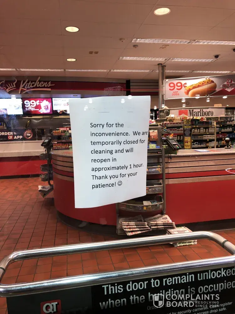 Today I visited 2 stores in about a 20 minute period no less than 3 times. I was trying to get items from the kitchen that they advertise so much. The first store's machine was down, which I understood because they were refilling the mix and you really can't help when they need refilling and there was another QT less than a mile from my home and I could just stop there. Well the Riverdale store decided that they would close their kitchen down and denied us service. I was confused and asked if they closed at a certain time. Her response was that they were too busy to open the kitchen due to only having 2 people to run the store. I told her what I needed and she told me that it would be a few minutes. I left and came back 10 minutes later. At that time she told me that it would be 45 mins before she would reopen! That's 3 visits to your atore with zero items to show for them except a bad experience. I called customer service and told my story to the person who answered and was promptly hung up on by Jason. All around I think I'll be avoiding you for both gas and food items for a while.